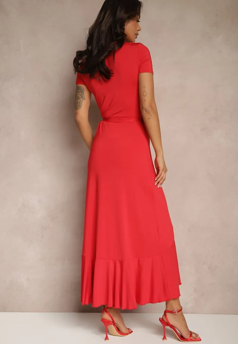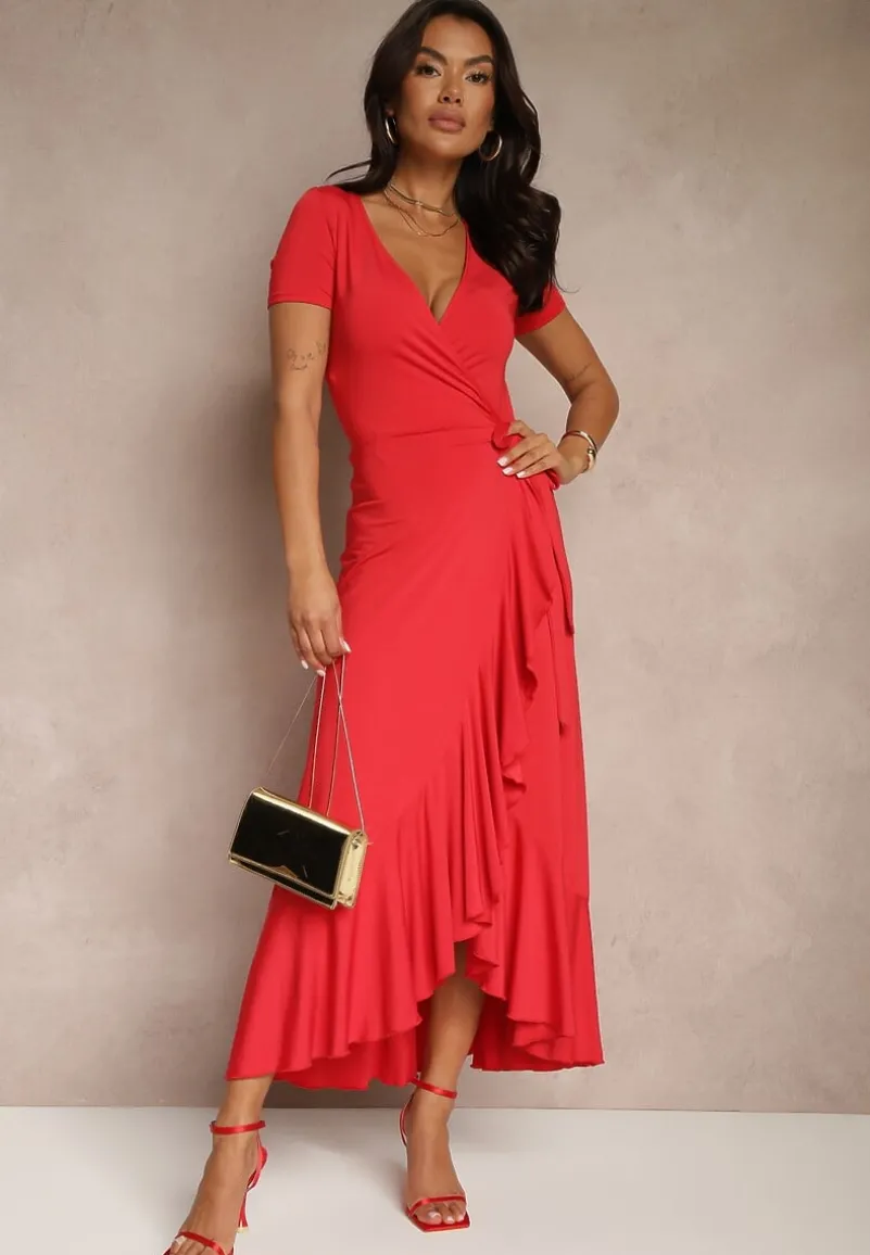 Czerwona Sukienka o Kopertowym Fasonie z Falbankami Zleffia