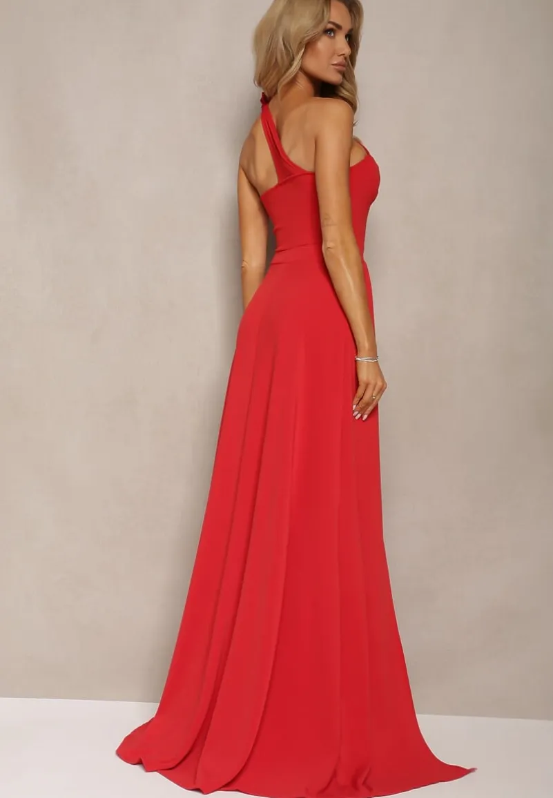 Czerwona Sukienka o Rozkloszowanym Kroju na Jedno Ramię z Głębokim Rozcięciem Efiela
