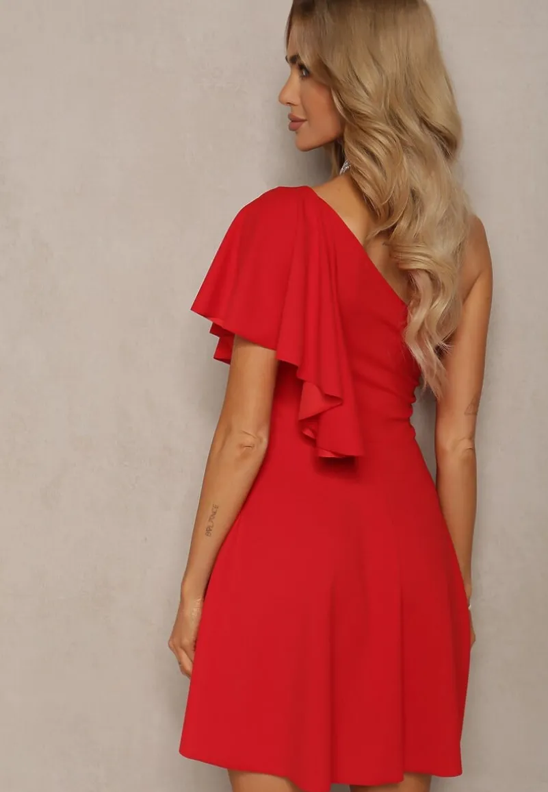 Czerwona Sukienka o Rozkloszowanym Kroju z Asymetryczną Górą na Jedno Ramię Ulubia