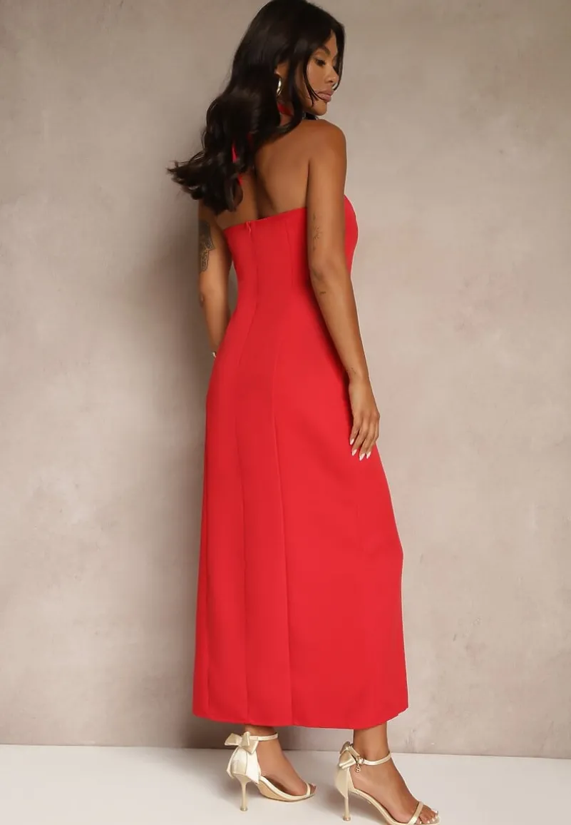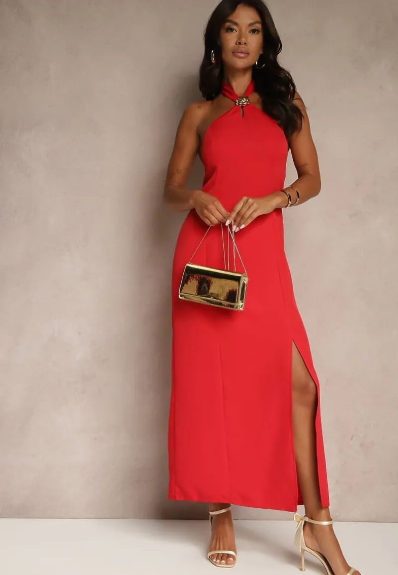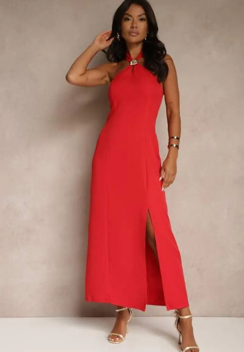 Czerwona Sukienka z Wiskozą z Dekoltem Halter i Ozdobną Broszką Naliannae