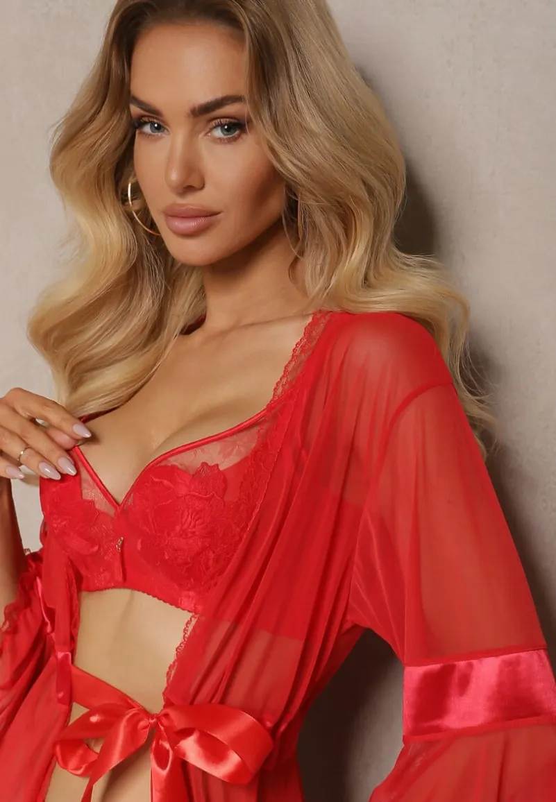 Szlafrok Placitra z wiązanym paskiem w pasie. Wykonany z prześwitującej tkaniny z wstawkami z koronki. W zestawie stringi.