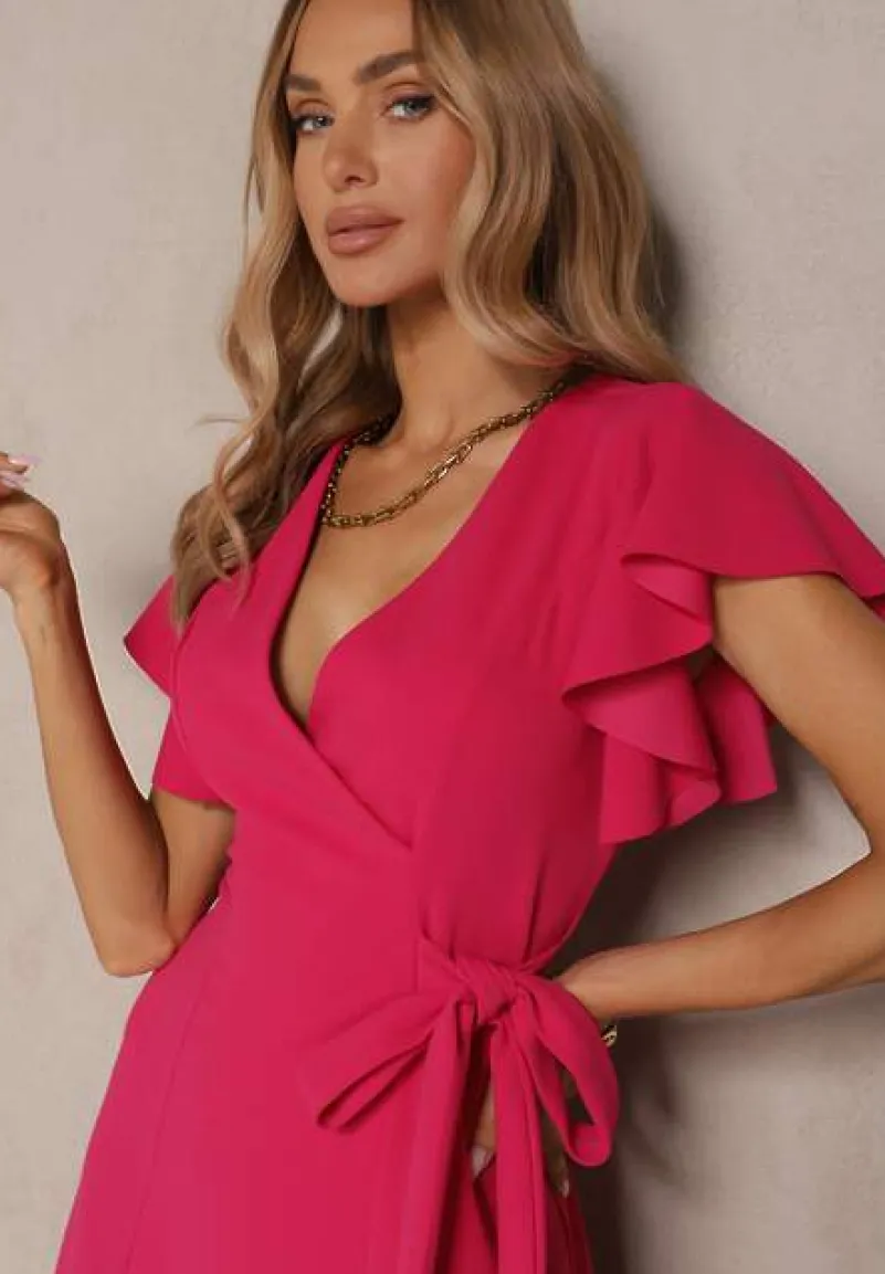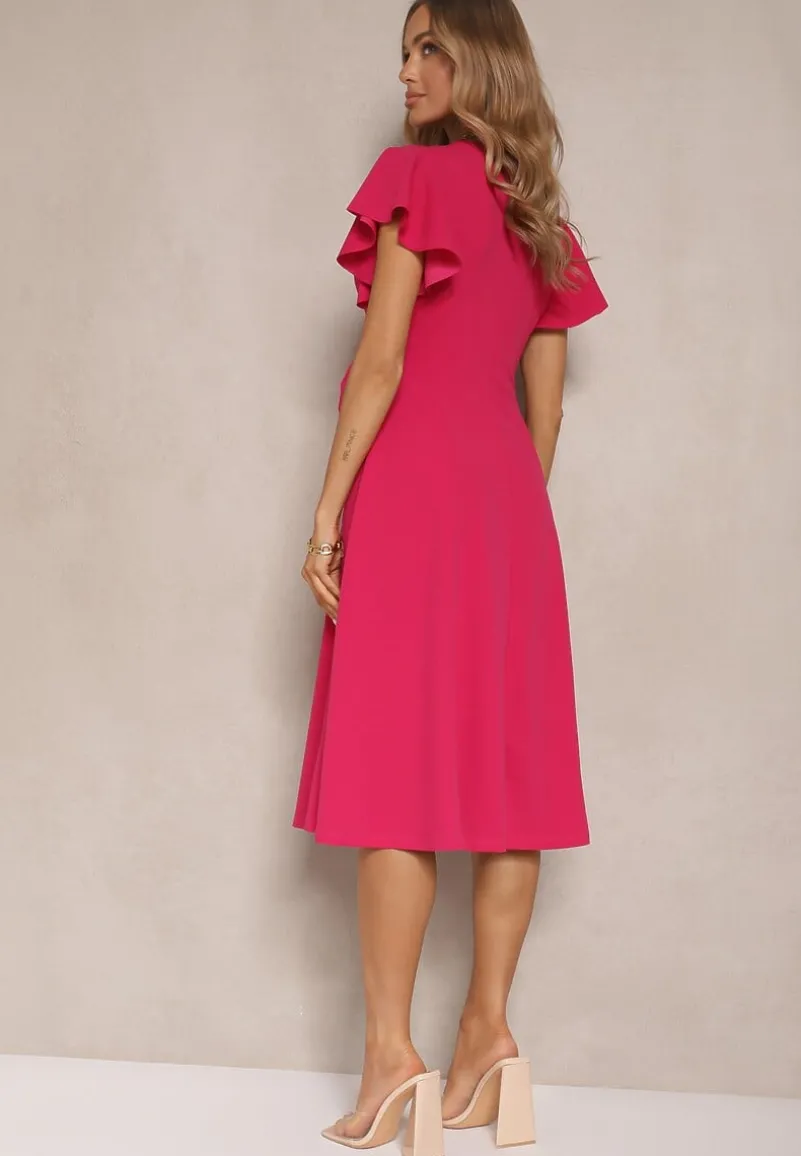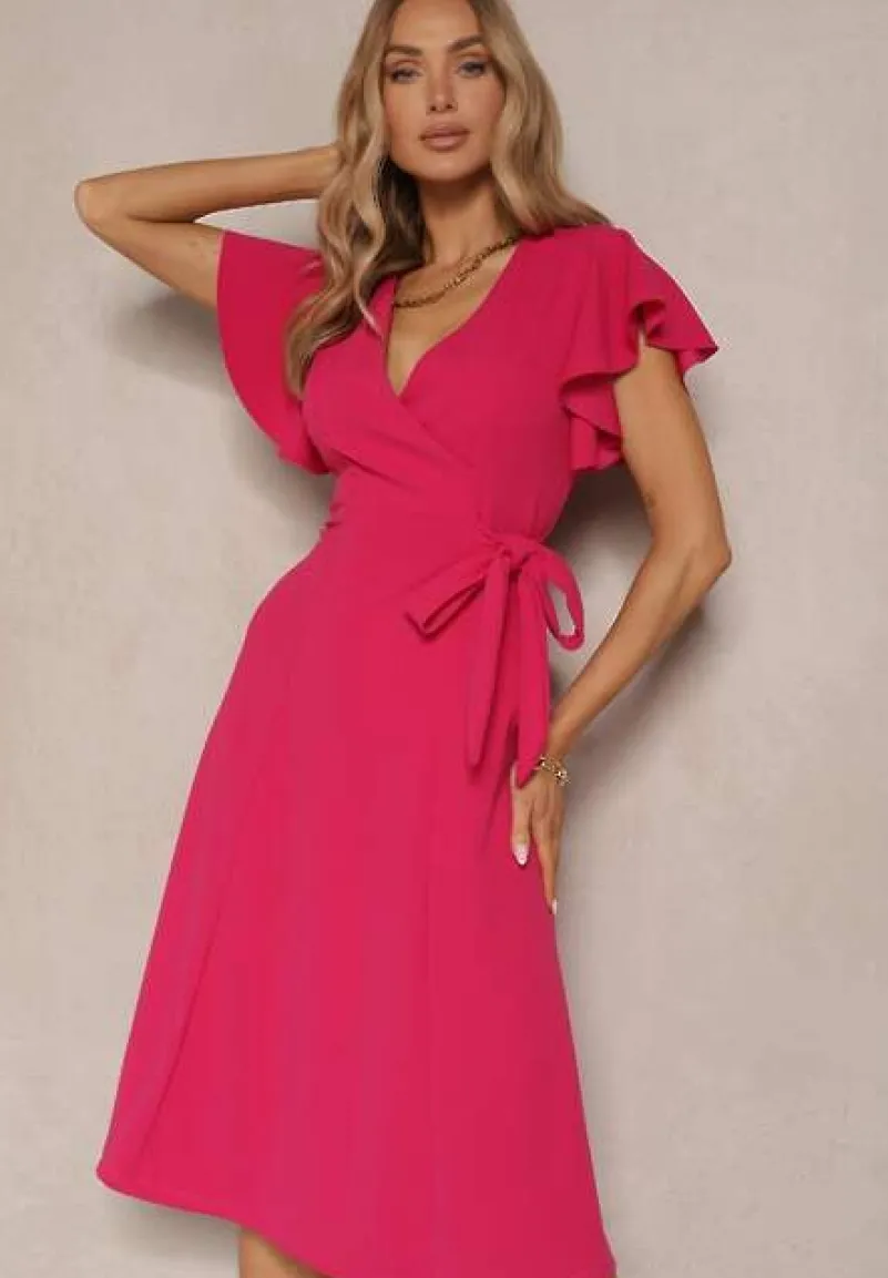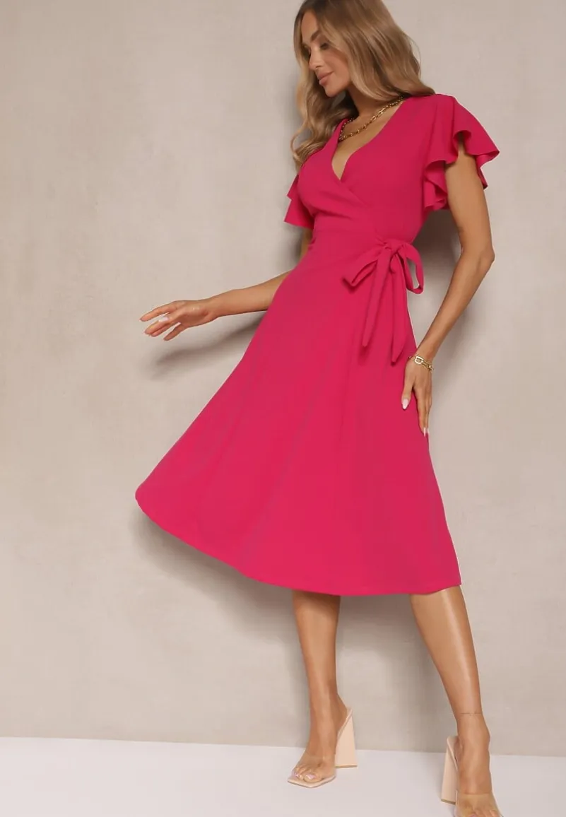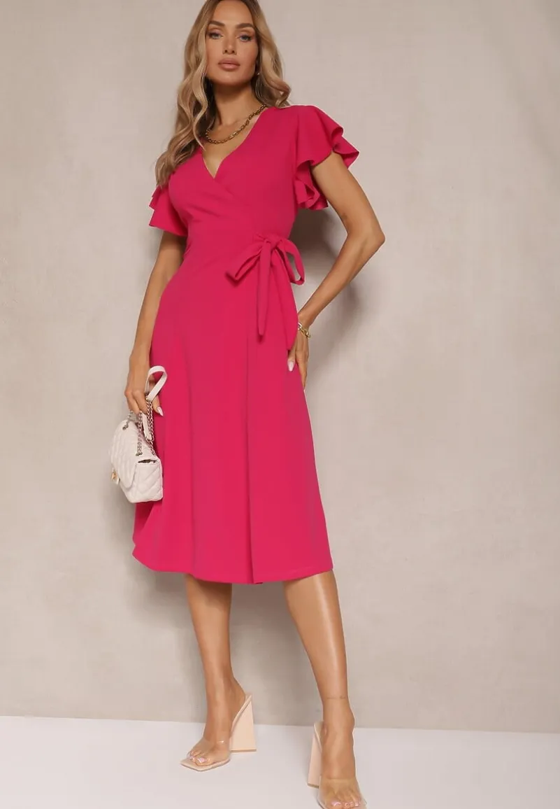 Fuksjowa Kopertowa Sukienka z Rozkloszowanym Dołem i Ozdobnym Wiązaniem Dannola