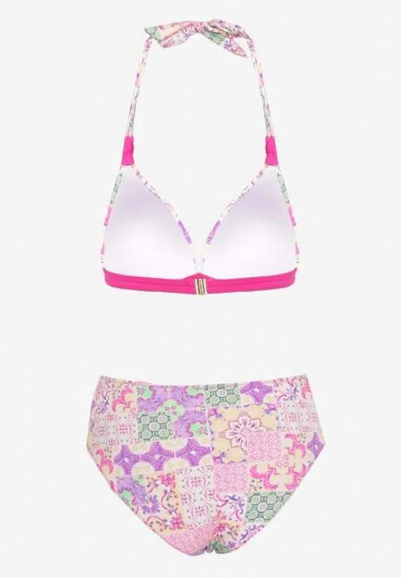 Fuksjowo-Beżowe Bikini w Mozaikowy Wzór z Biżuteryjną Klamerką Vextella