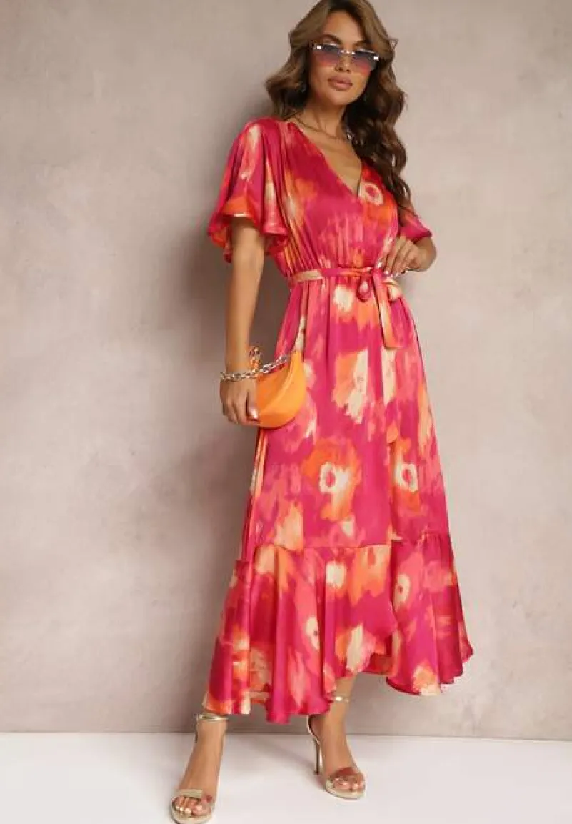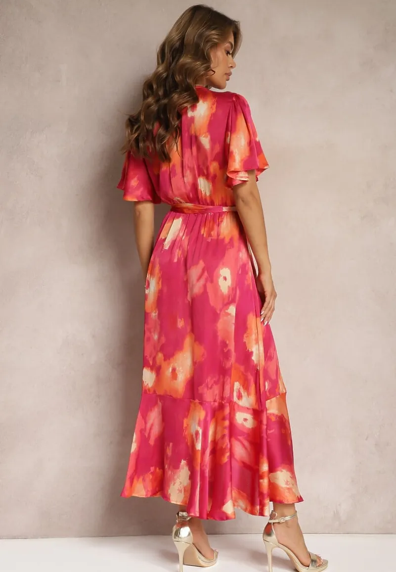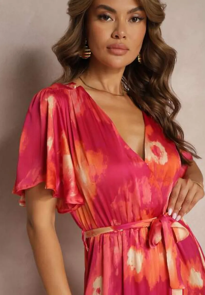 Fuksjowo-Pomarańczowa Kopertowa Sukienka z Gumką w Talii Wiązana Materiałowym Paskiem Vikisana