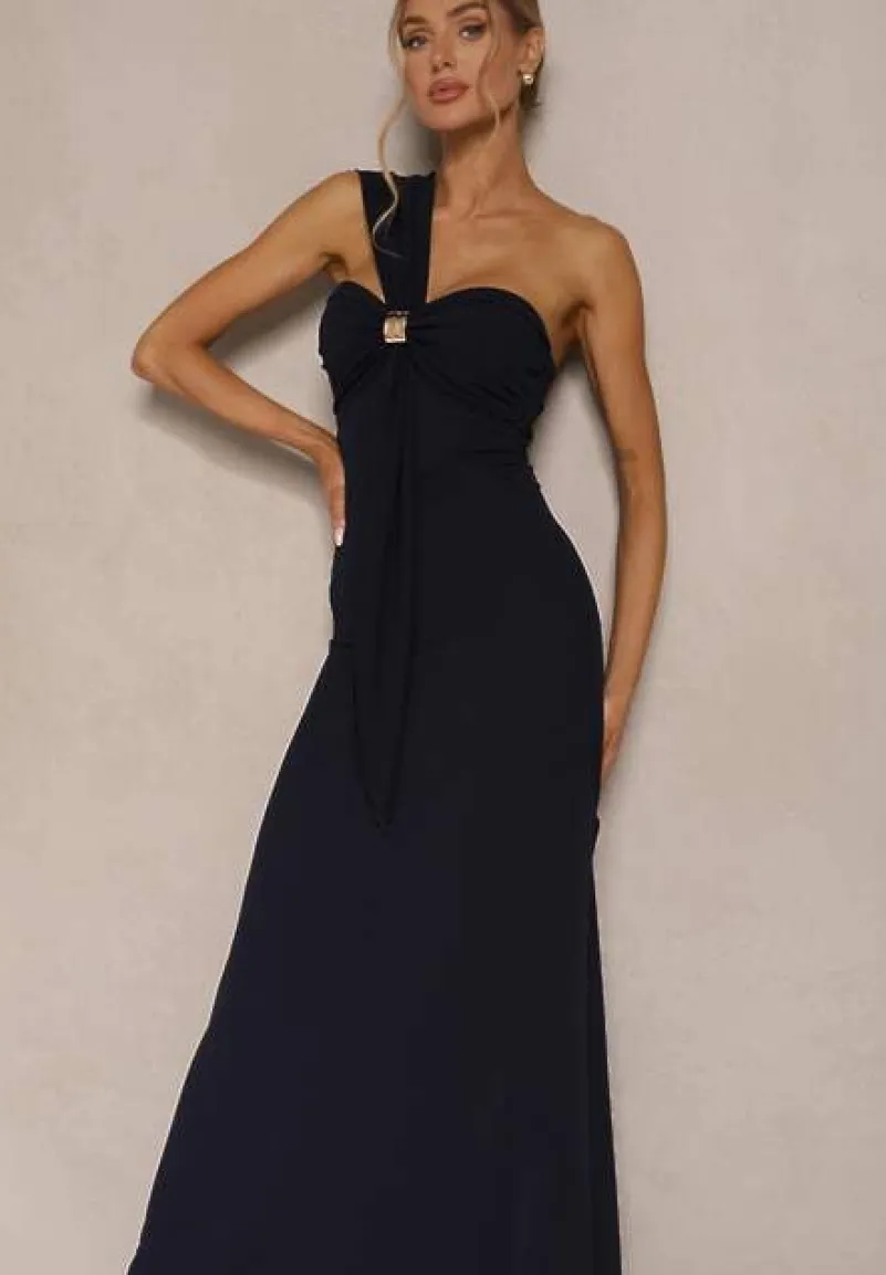 Granatowa Asymetryczna Sukienka Koktajlowa Ozdobiona Metaliczną Aplikacją Divianis