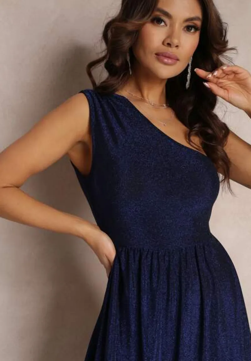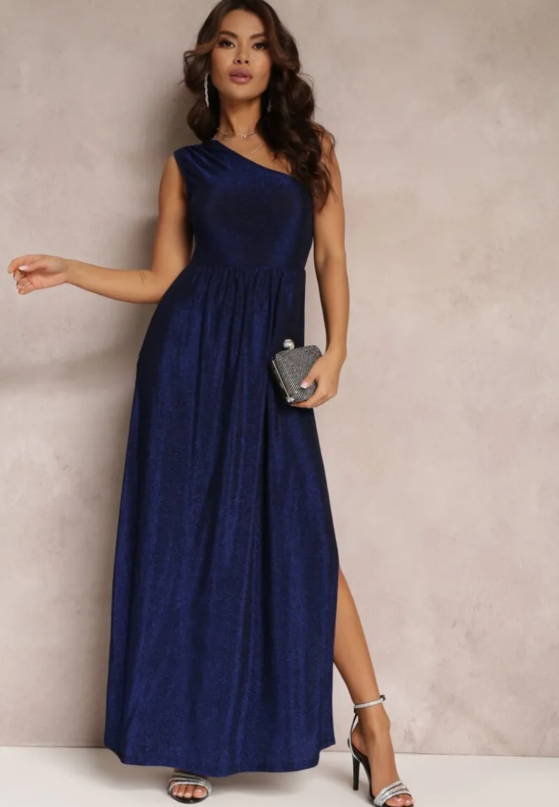 Granatowa Brokatowa Sukienka Maxi z Asymetryczną Górą i Rozkloszowanym Dołem Eulita