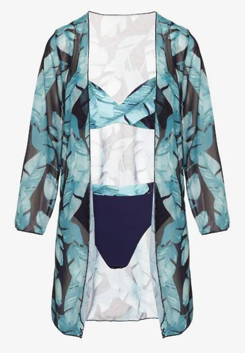 Bikini Majtki Figi Biustonosz z regulowanymi ramiączkami, zapinany z tyłu na metalowe zapięcie i Siateczkowa Narzutka Folanisse to idealny zestaw na letnie przygody! Zaskoczy Cię modny wzór w liście, który doda świeżości i energii Twoim stylizacjom. Siateczkowa narzutka doskonale uzupełnia całość, tworząc look perfekcyjny na plażę lub przy basenie. Stylizuj go z oversize’owymi szortami i klapkami na co dzień.