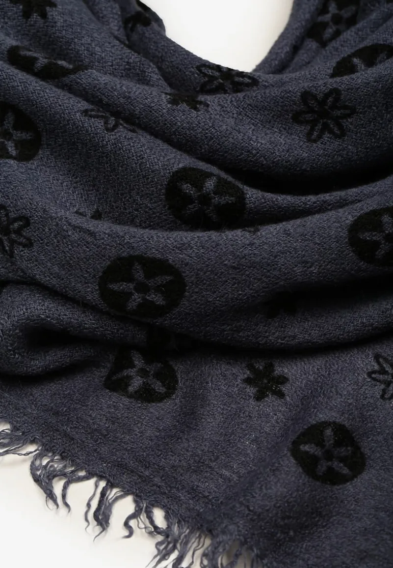 Granatowy Szalik Ozdobiony Geometrycznym Motywem z Frędzlami Nomirya