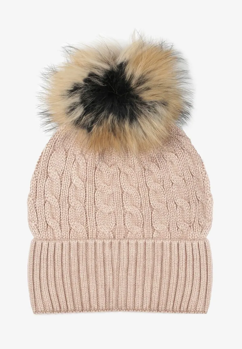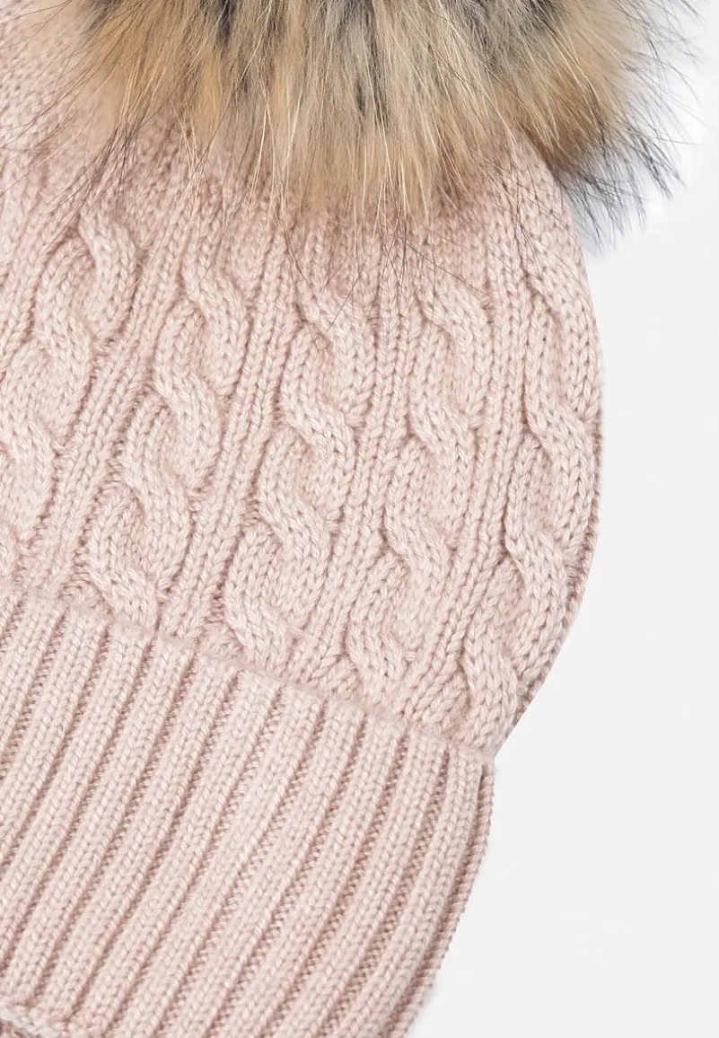 Ciemnoszara Czapka Don’t Leave Me z grubym, warkoczowym splotem i wykładanym dołem. Na górze duży, puszysty pompon.