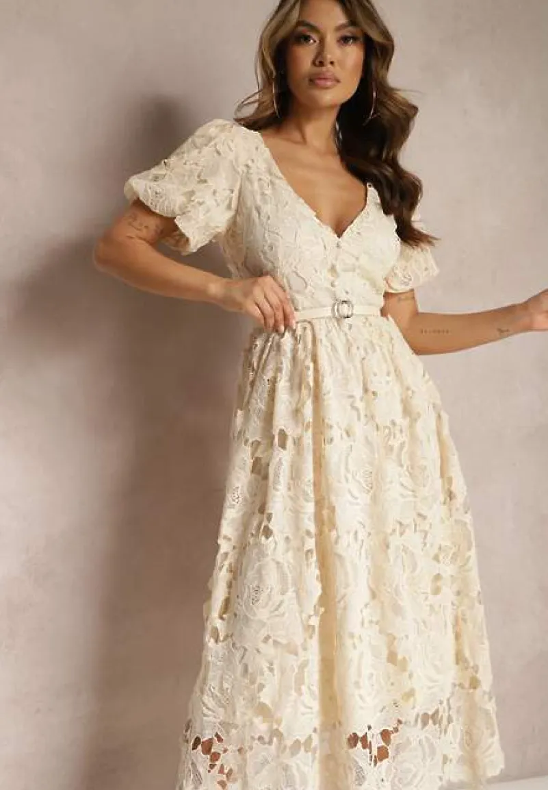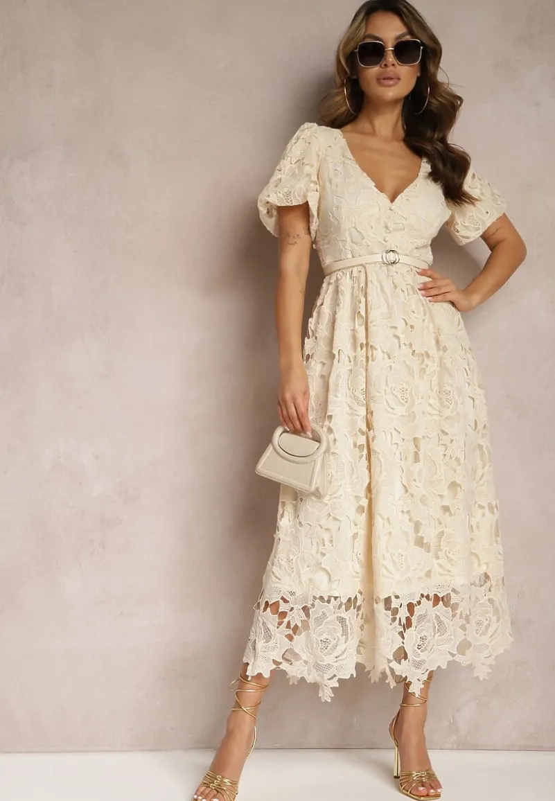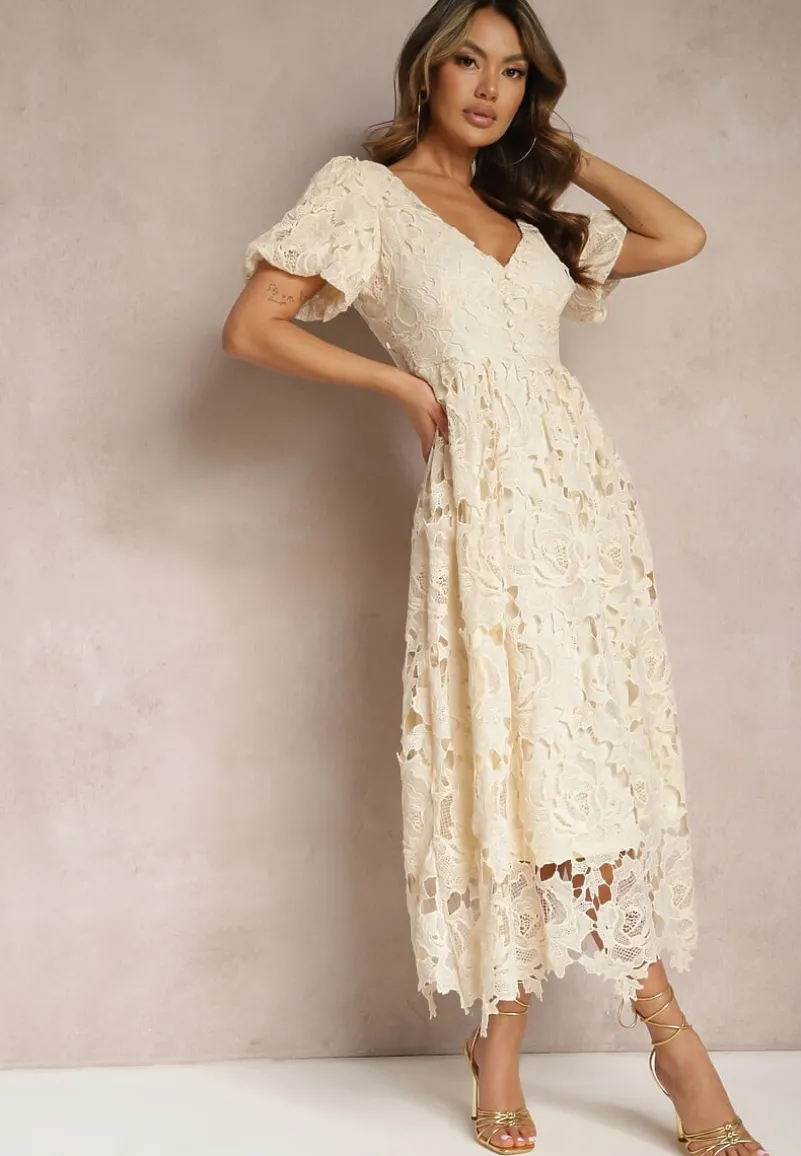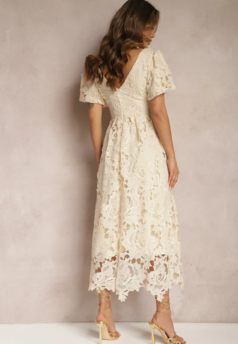 Jasnobeżowa Koronkowa Sukienka Koktajlowa z Głębokim Trójkątnym Dekoltem Wrenna