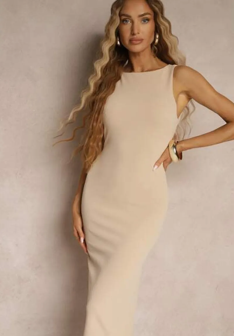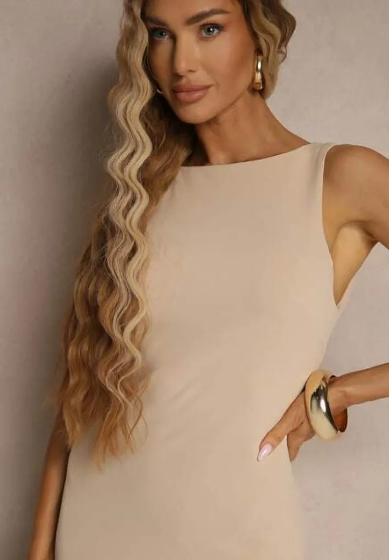 Jasnobeżowa Ołówkowa Sukienka Bez Rękawów z Wiskozą Zdobiona Rozcięciem z Tyłu Fonama