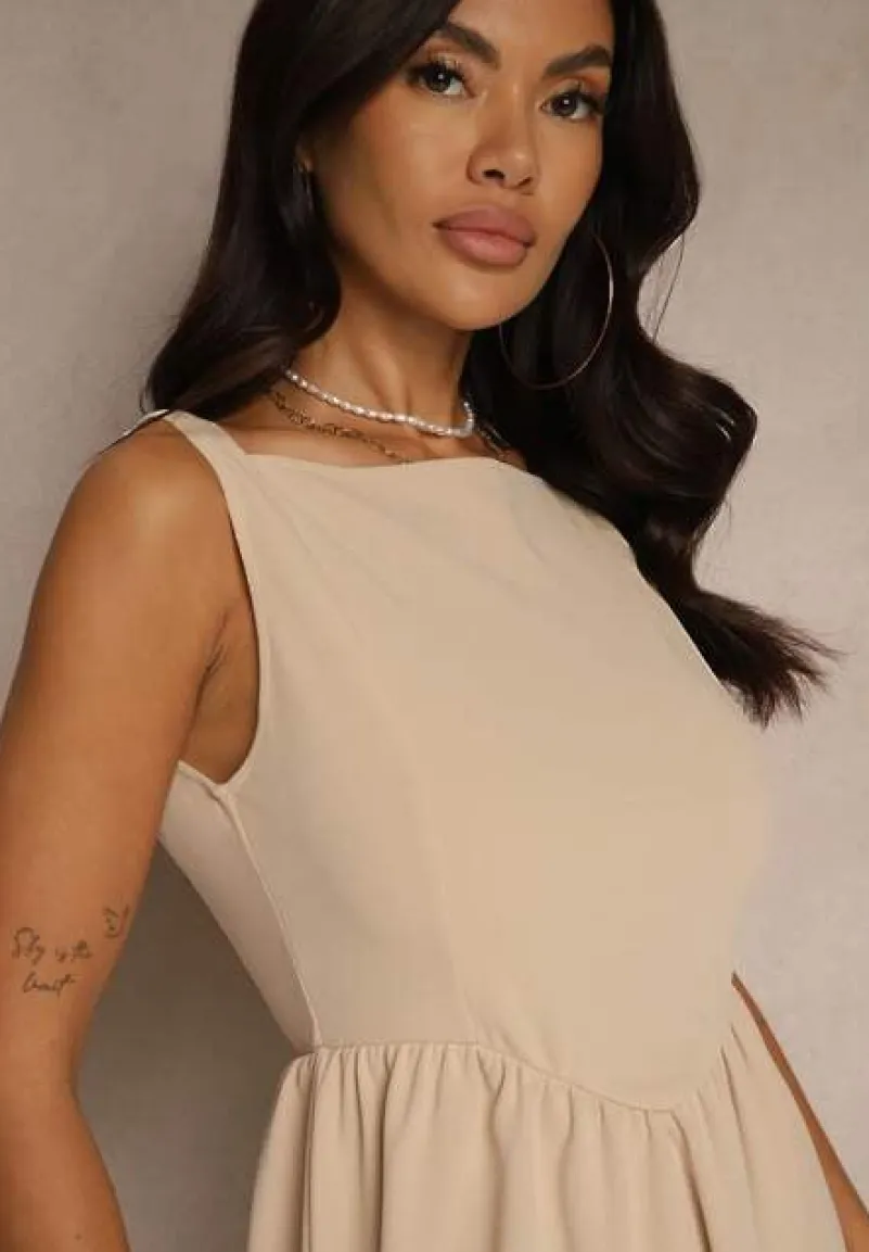 Jasnobeżowa Sukienka Koktajlowa z Wiskozą o Rozkloszowanym Kroju Tilurea