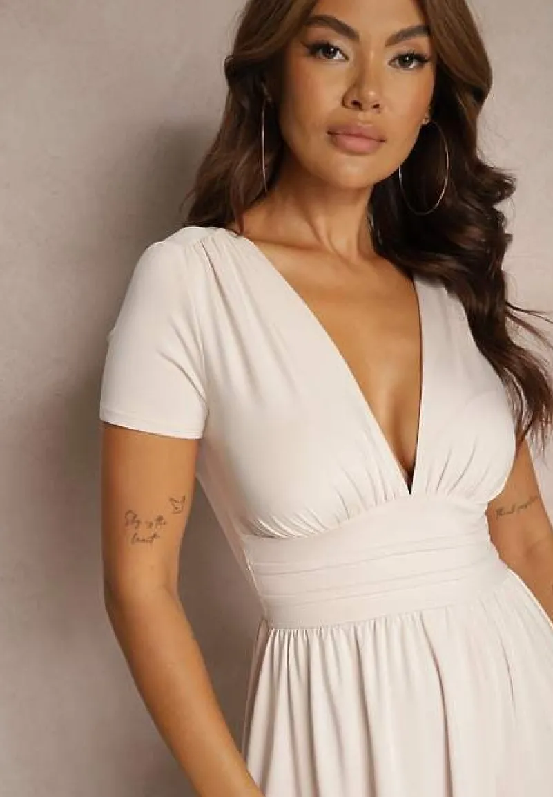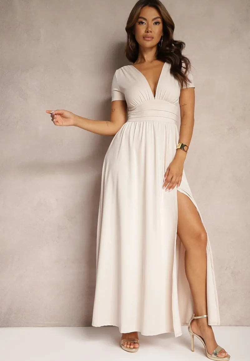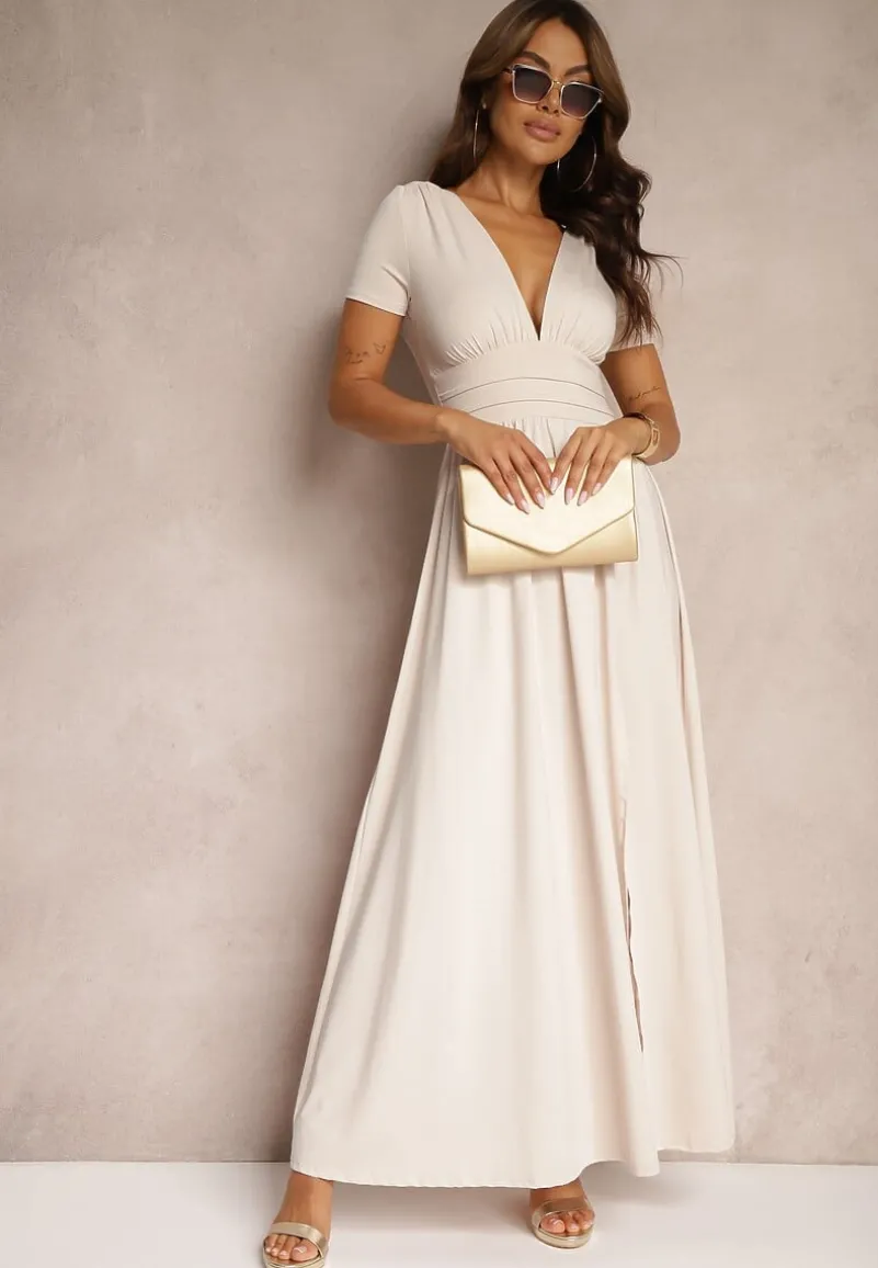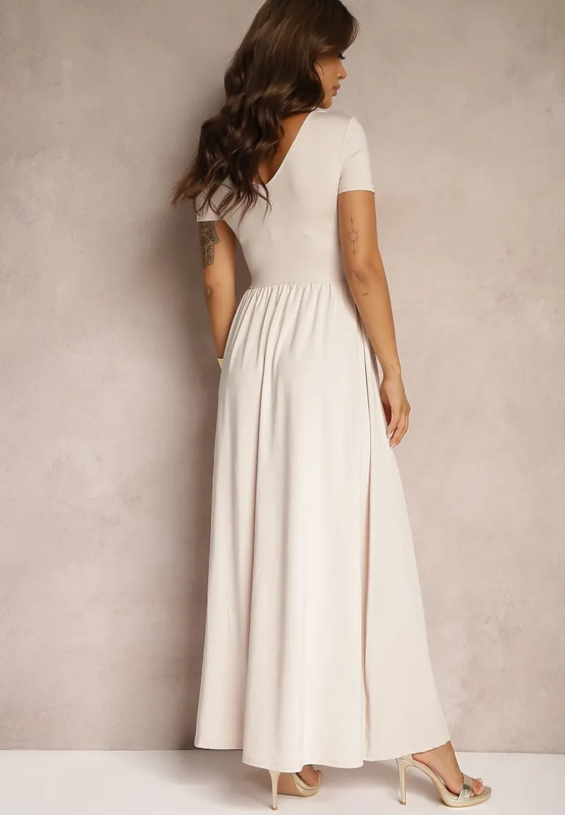Jasnobeżowa Sukienka Maxi z Rozkloszowanym Dołem i Rozcięciem Zarya