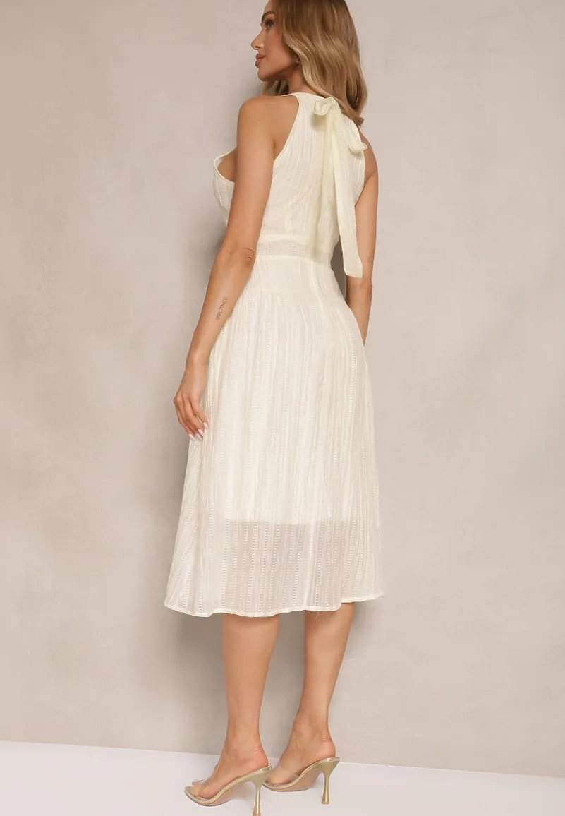 Jasnobeżowa Sukienka o Rozkloszowanym Kroju z Wiązaniem Zdobiona Tłoczeniem Nimirelle