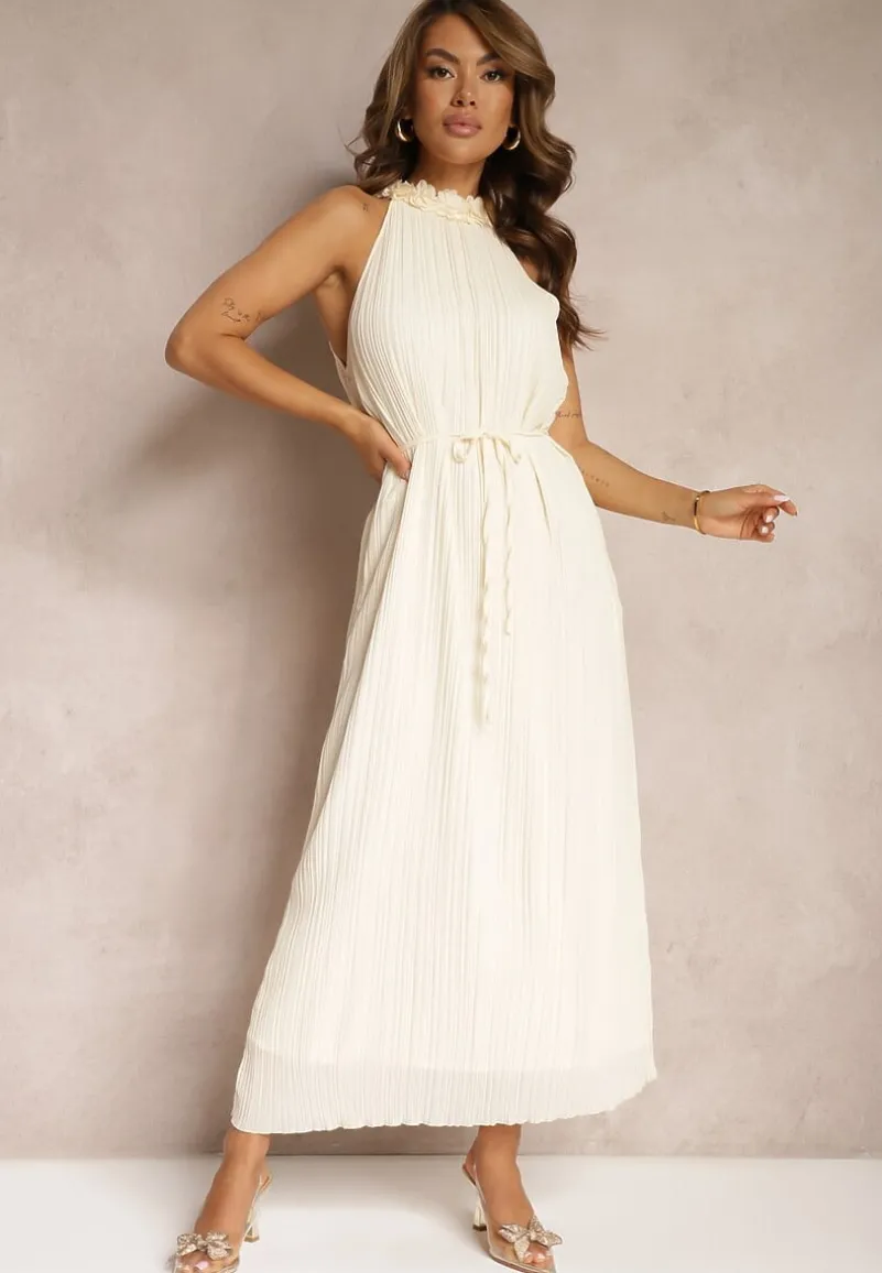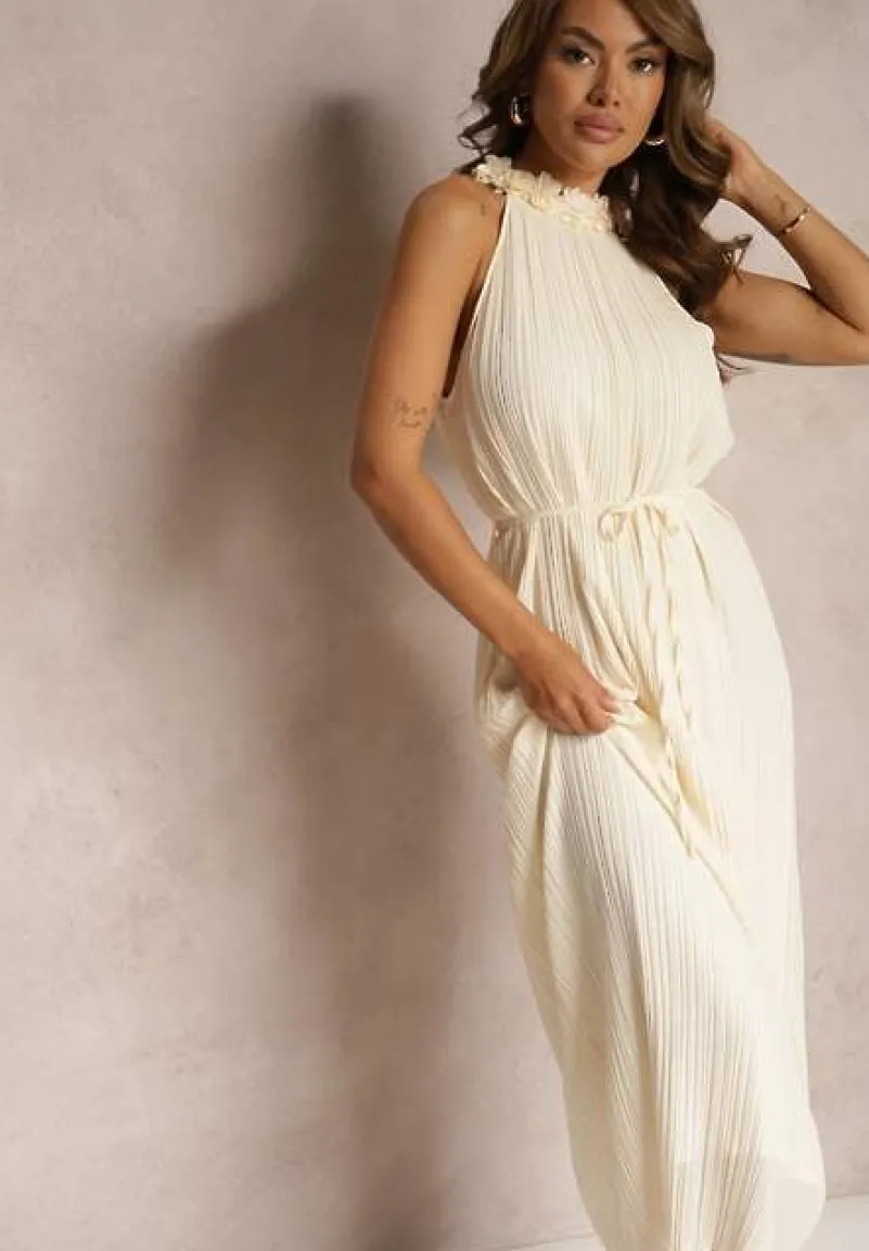 Jasnobeżowa Sukienka z Dekoltem Typu Halter z Materiałowym Paskiem w Talii i Aplikacjami 3D Dimnnia