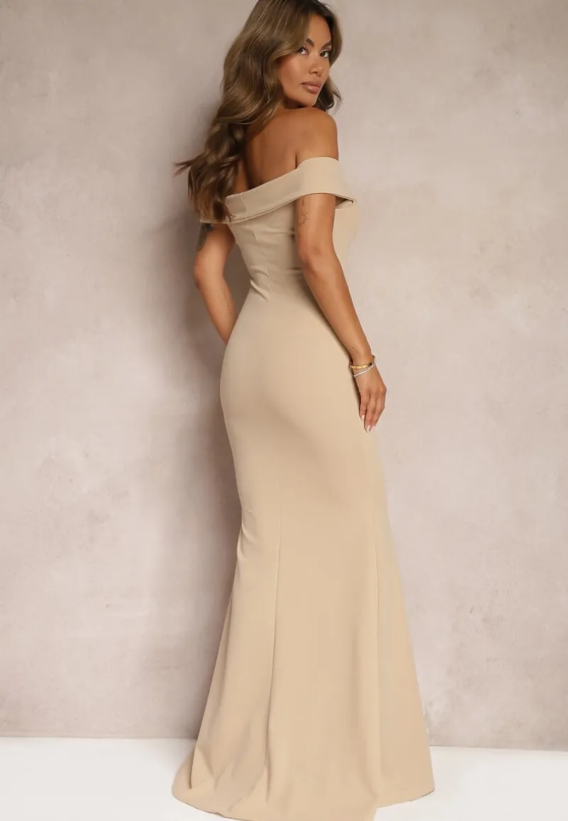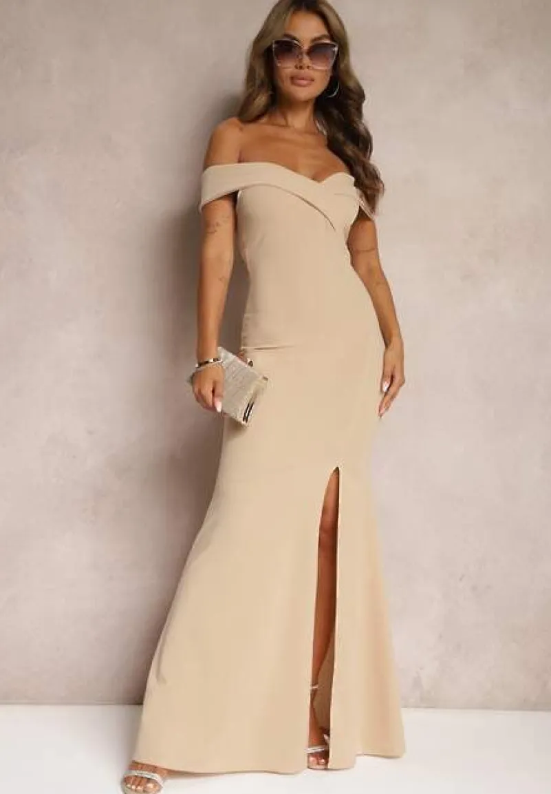 Jasnobeżowa Taliowana Sukienka Maxi z Rozcięciem Perlina