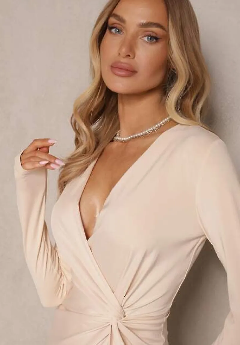 Jasnobeżowa Taliowana Sukienka z Dodatkiem Wiskozy Ozdobiona Marszczeniami Heriova