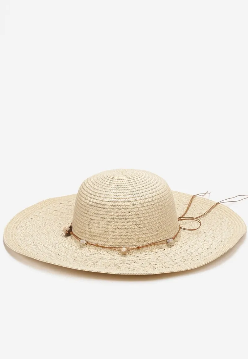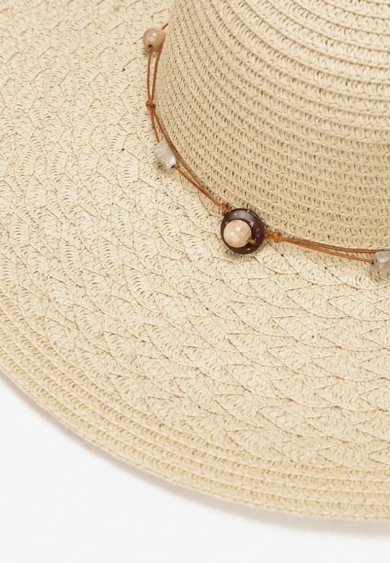 Szeroki kapelusz z papierowej plecionki. Udekorowany rzemykiem z kamyczkami.