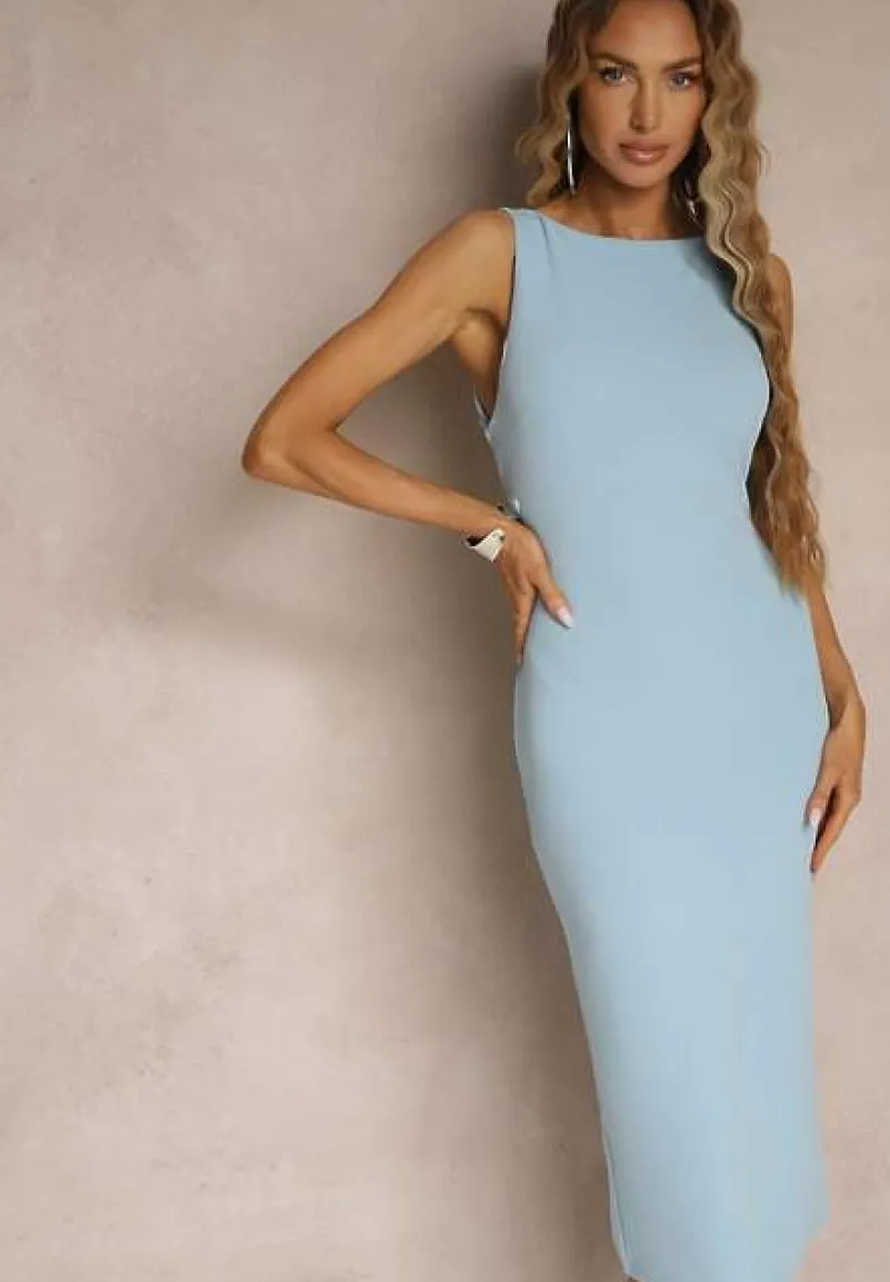 Jasnoniebieska Ołówkowa Sukienka Bez Rękawów z Wiskozą Zdobiona Rozcięciem z Tyłu Fonama