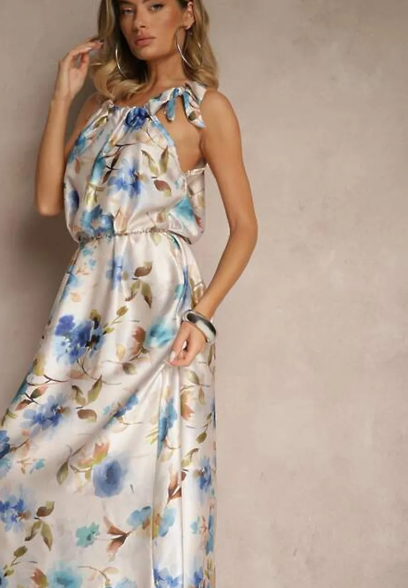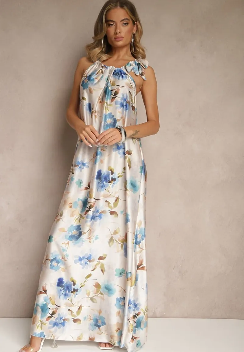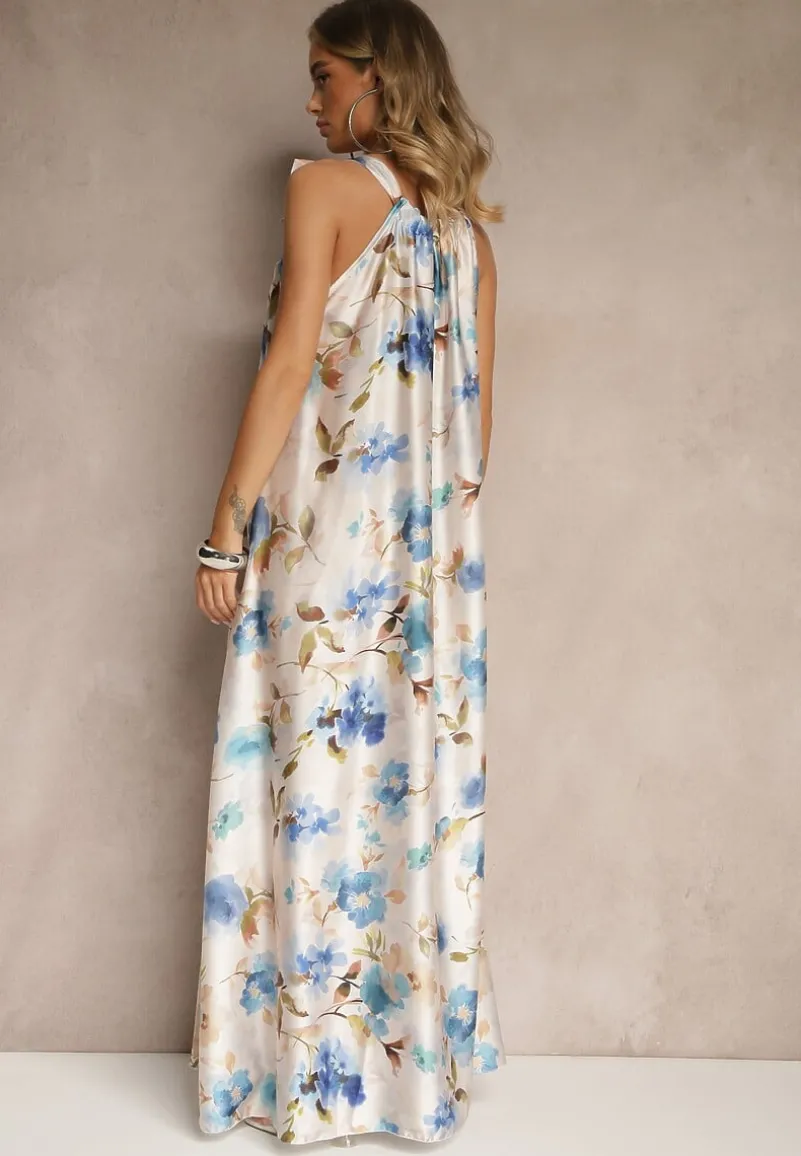 Jasnoniebieska Sukienka z Satyny w Kwiatowy Wzór Fenimea