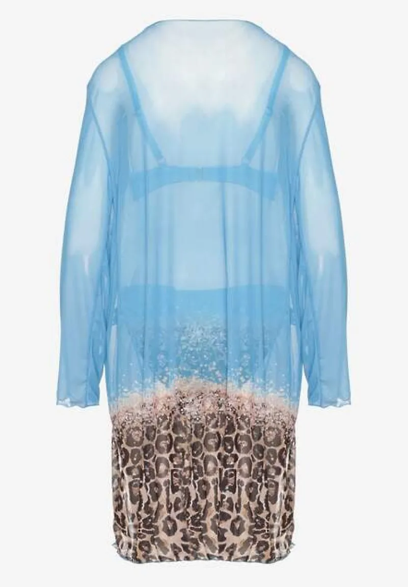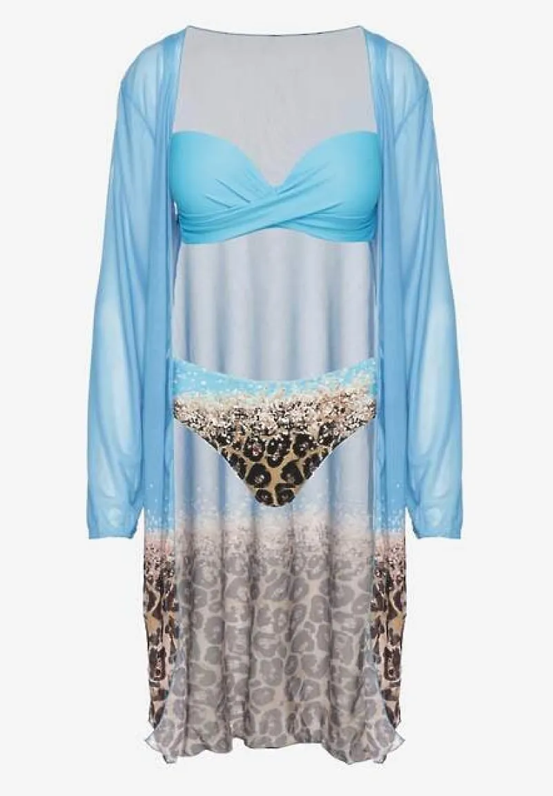 Jasnoniebieski Komplet Bikini Majtki Figi Biustonosz i Narzutka w Panterkę Paselina