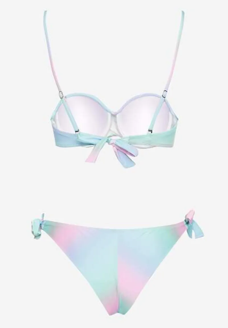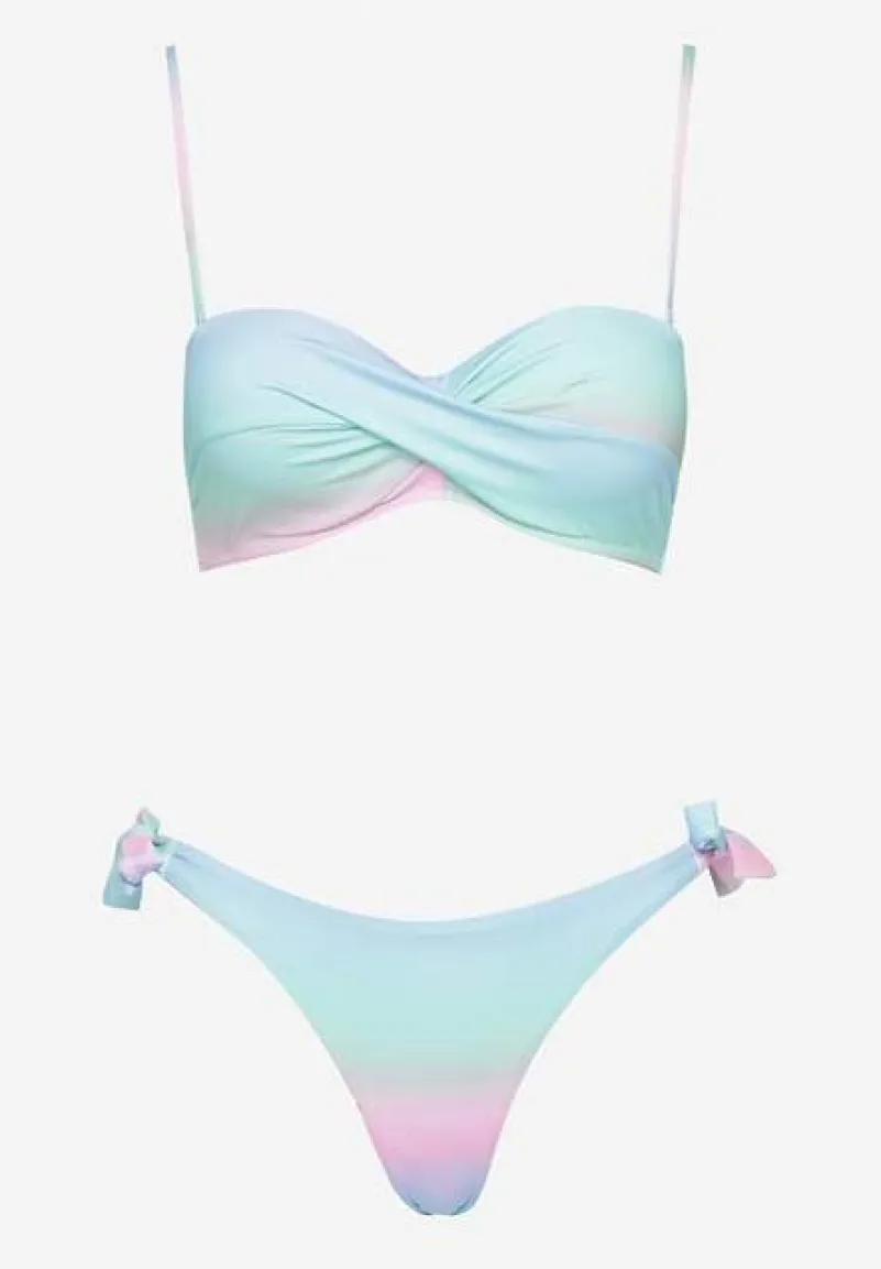 Jasnoniebieskie Bikini Majtki Typu Figi i Biustonosz z Marszczeniem w Geometryczny Wzór Kinnira