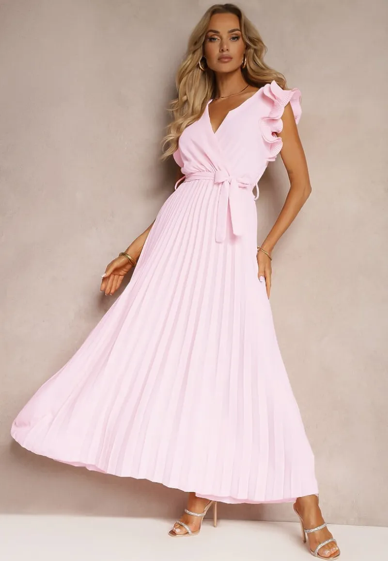 Jasnoróżowa Kopertowa Sukienka z Gumką w Pasie i Materiałowym Paskiem Ozdobiona Falbankami Tiamatalia