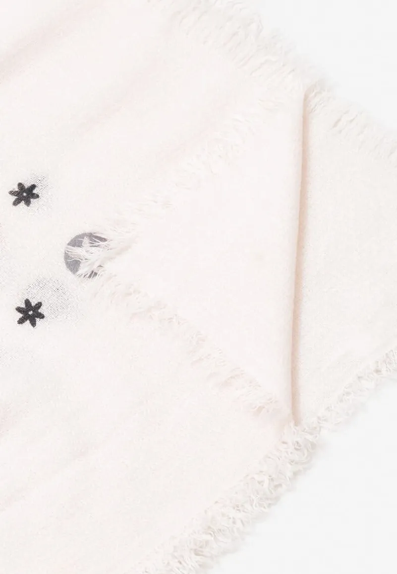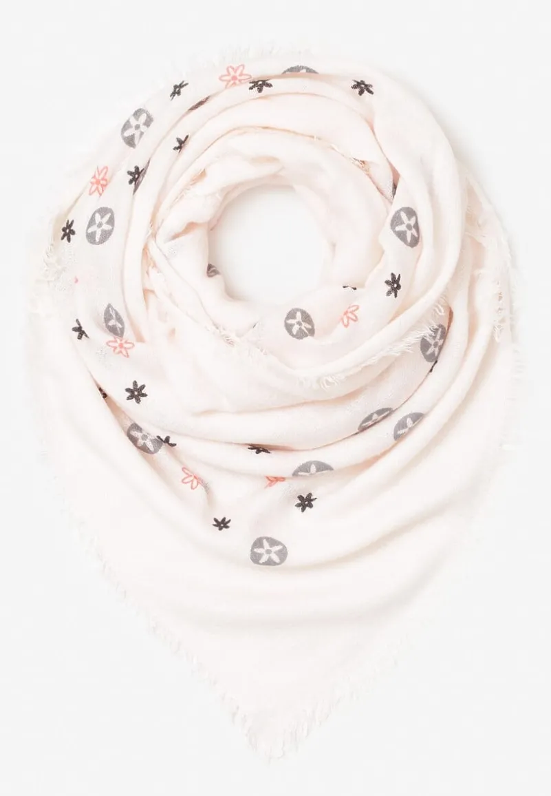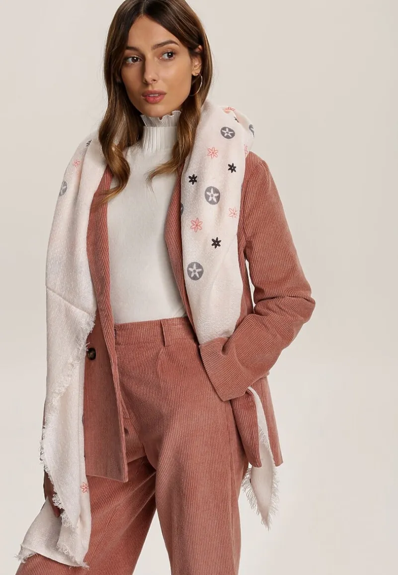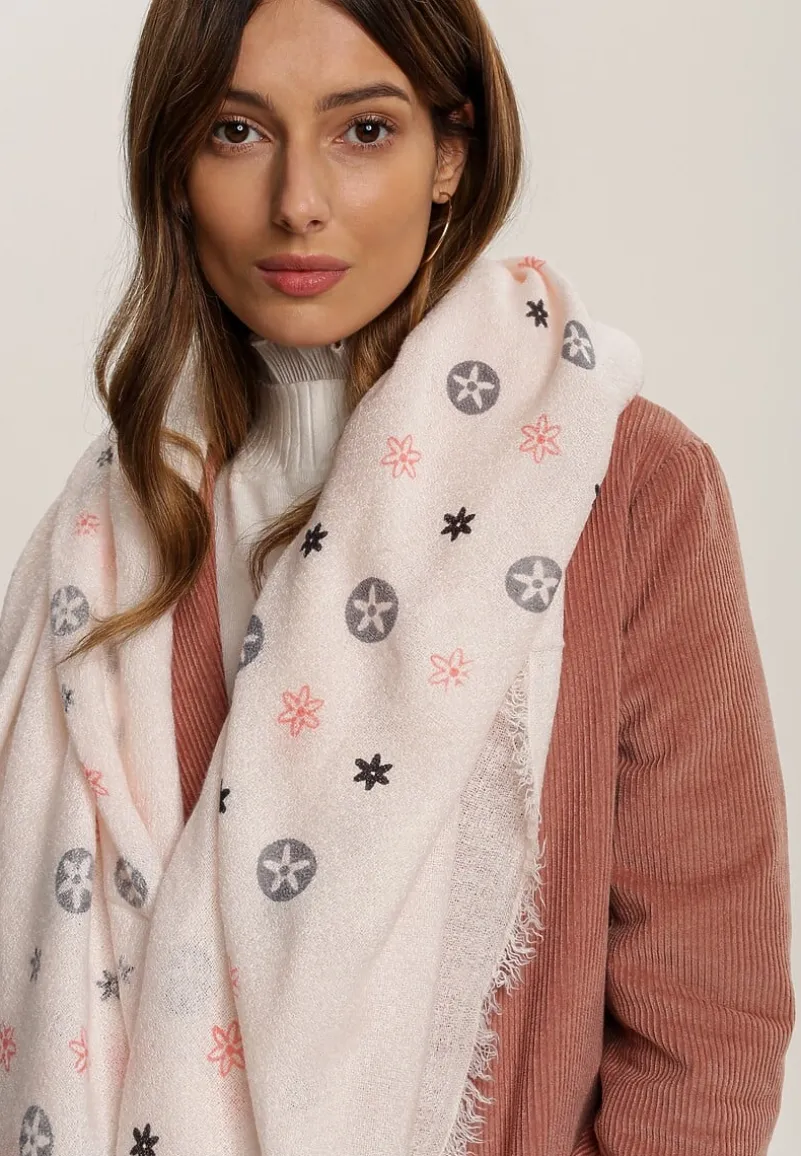 Szalik Juliana częściowo zdobiony kwiatowym printem. Brzegi delikatnie wystrzępione, wykonany z tkaniny. Szalik sprawdzi się na jesień oraz zimę. Drobny i uroczy wzór ożywi wiele outfitów, a Tobie doda mnóstwa wdzięku.