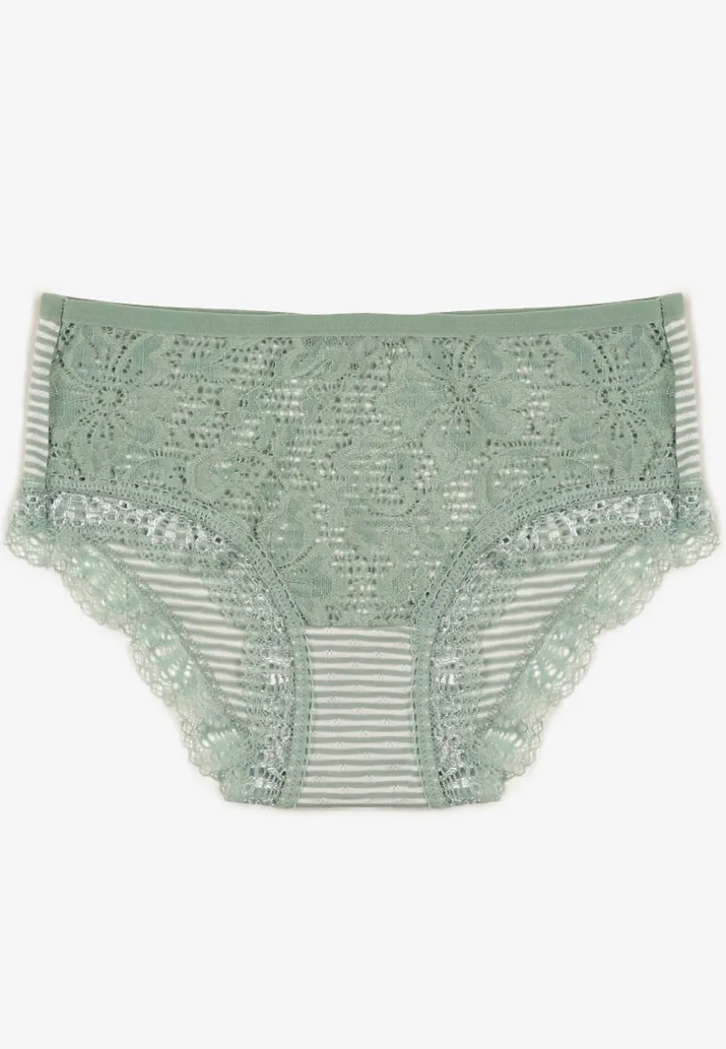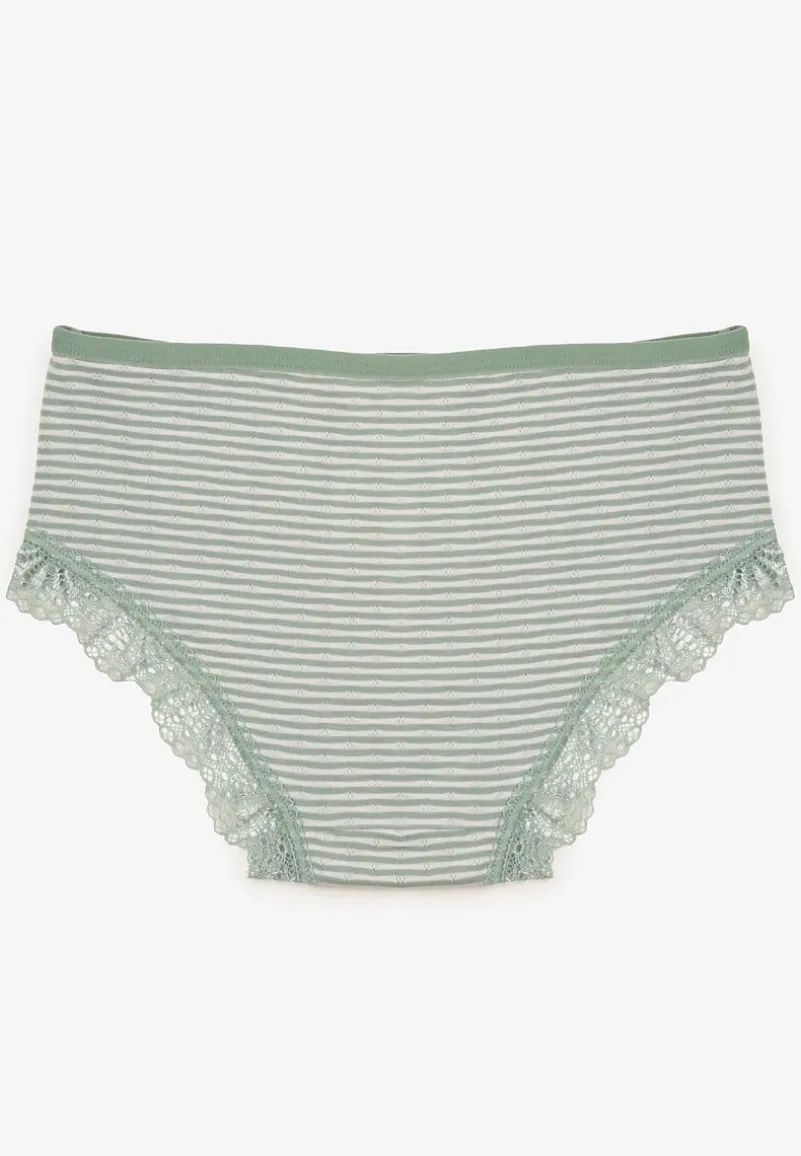 Majtki typu figi Kathrin wykonane z bawełny. Z przodu ozdobione koronką w kwiatki, a z tyłu cienkimi paskami. Będą świetne na co dzień!