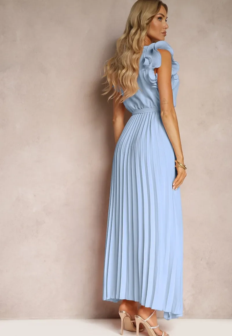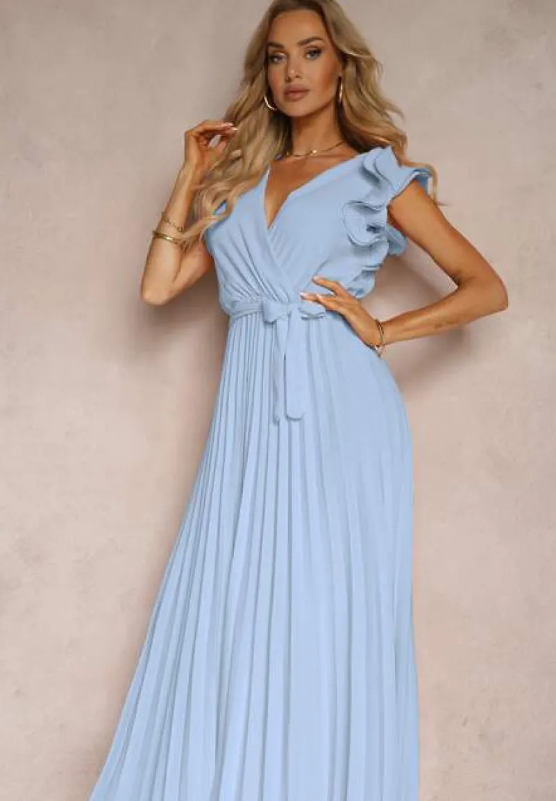 Niebieska Kopertowa Sukienka z Gumką w Pasie i Materiałowym Paskiem Ozdobiona Falbankami Tiamatalia