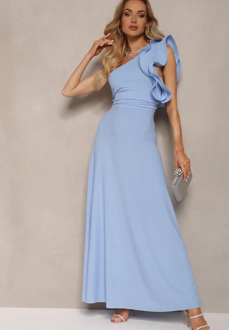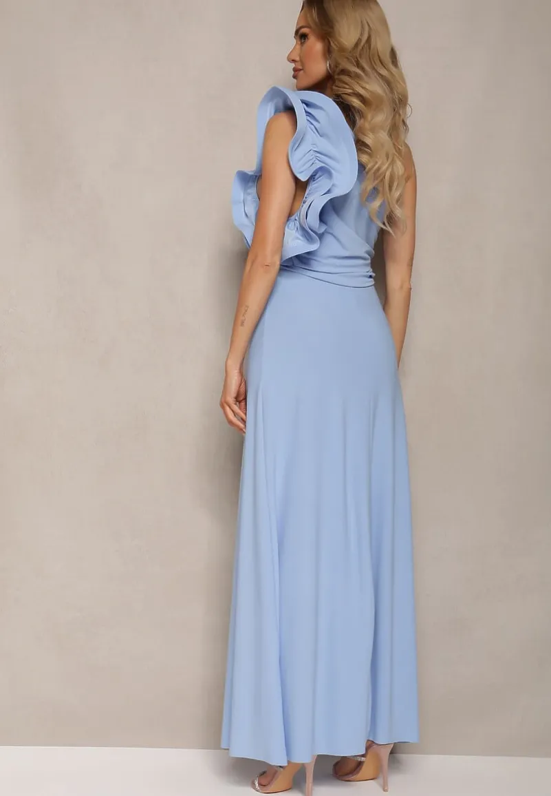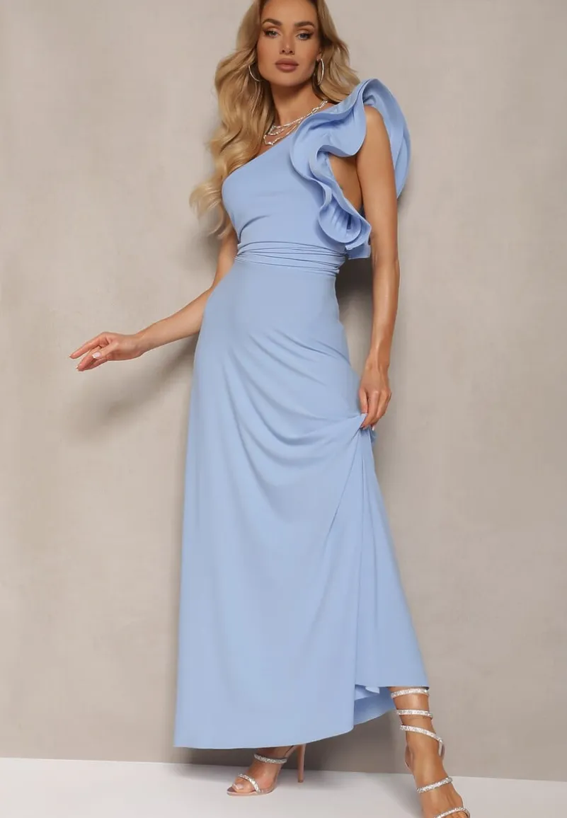 Niebieska Rozkloszowana Sukienka Asymetryczna z Dużymi Falbanami przy Ramionach Cevada