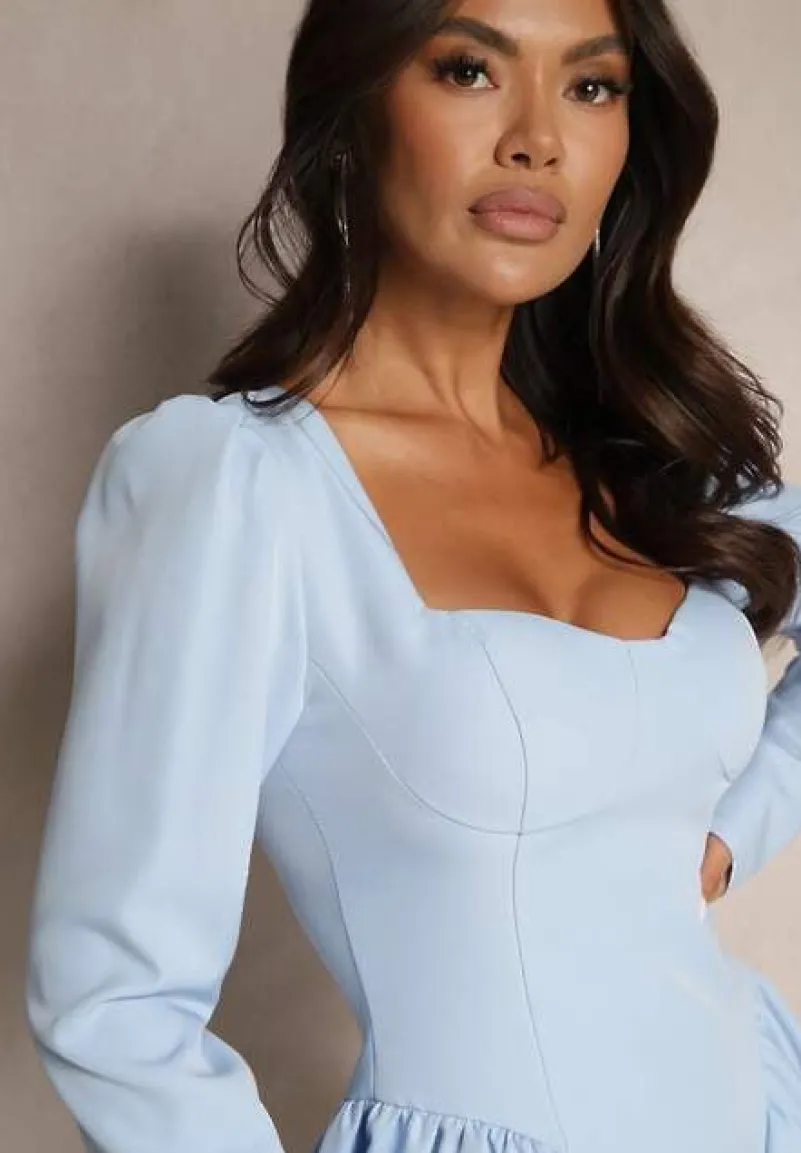 Niebieska Rozkloszowana Sukienka Koktajlowa z Gorsetową Górą i Falbankami Arisora