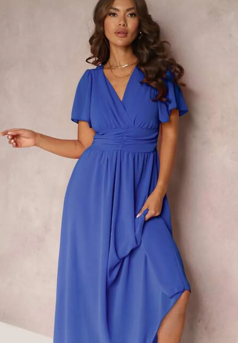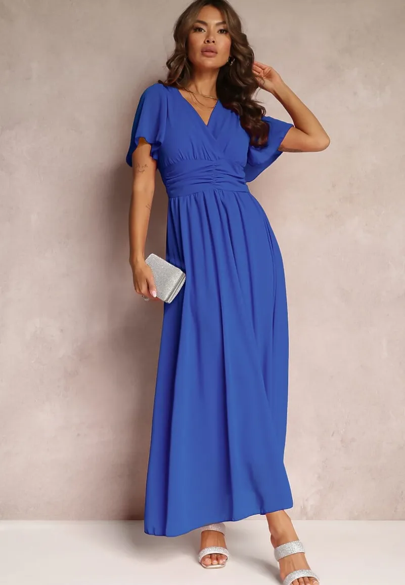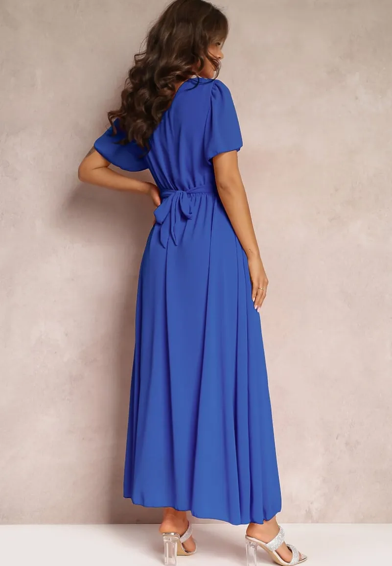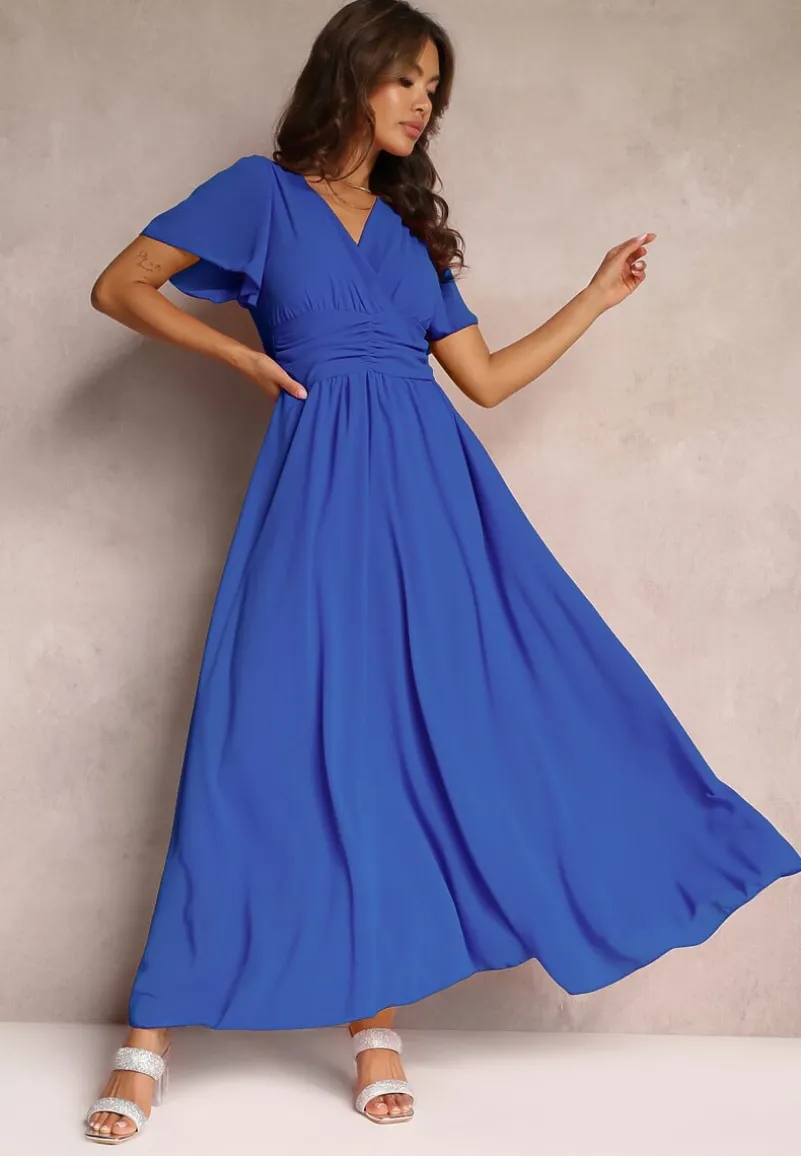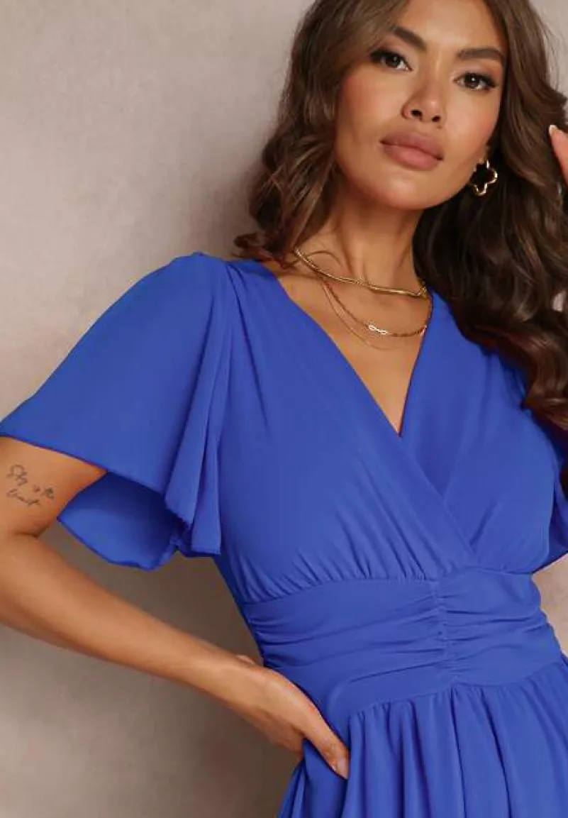 Niebieska Rozkloszowana Sukienka z Kopertowym Dekoltem Obillis