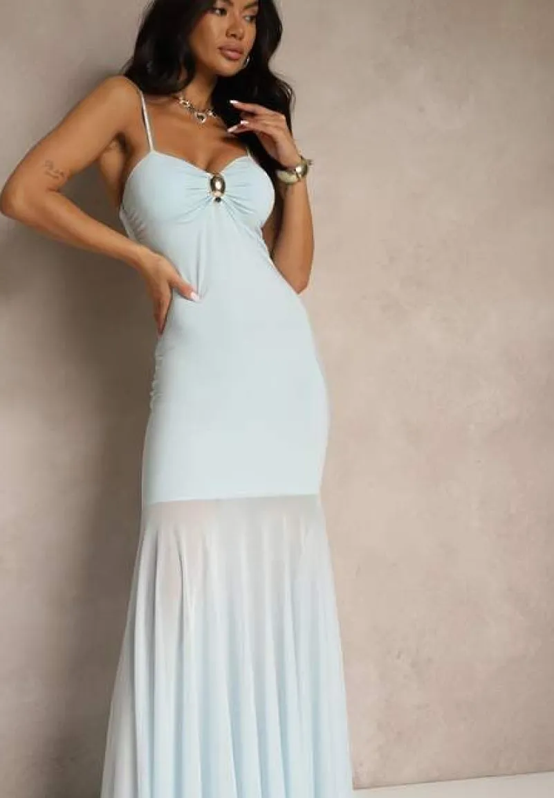 Niebieska Sukienka na Ramiączkach z Wiskozą z Siateczkowym Zdobieniem Savorielle