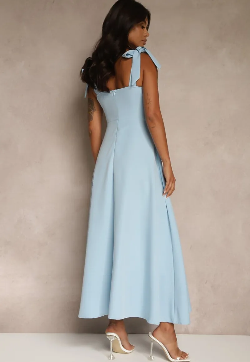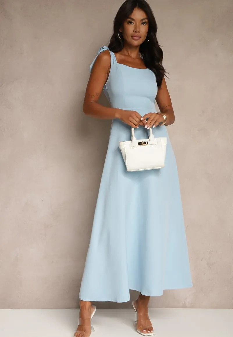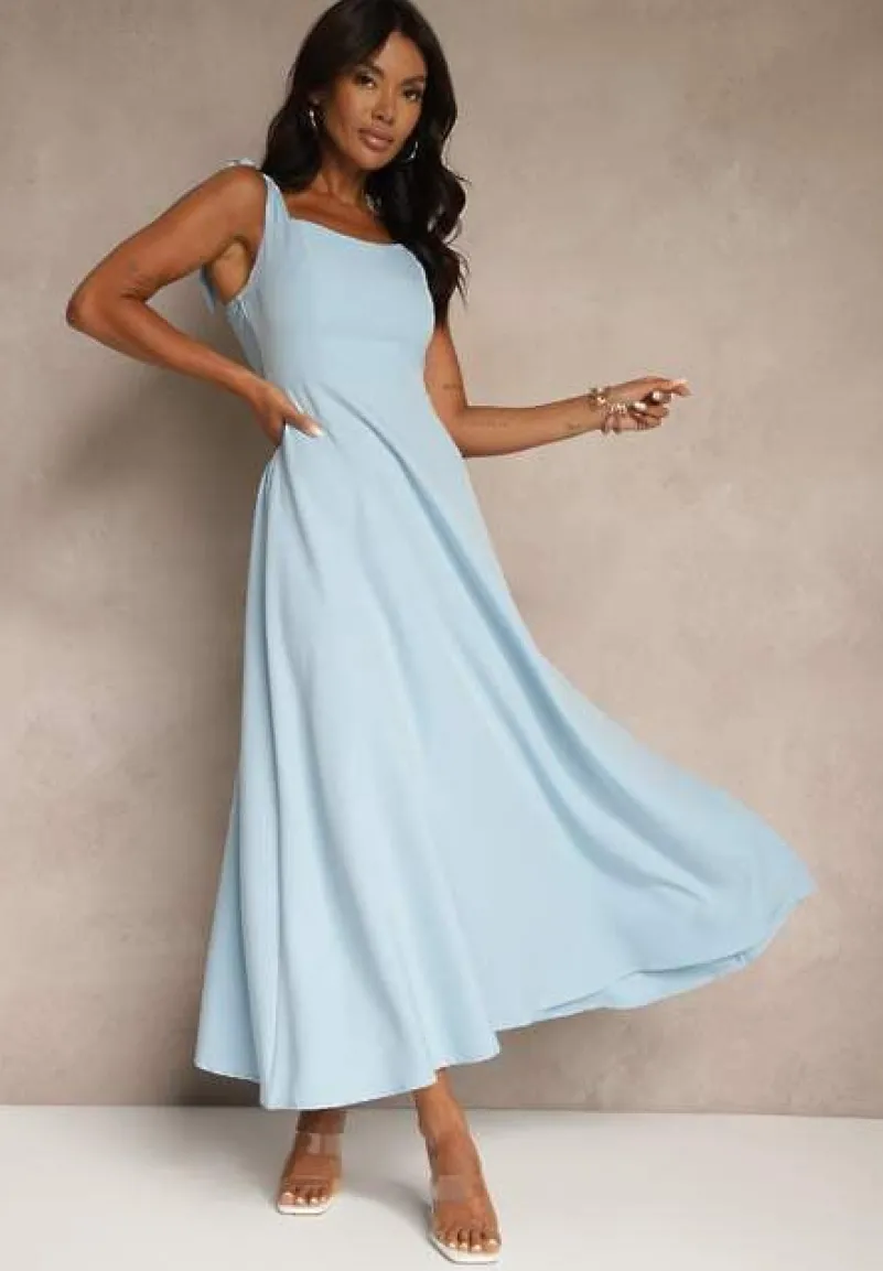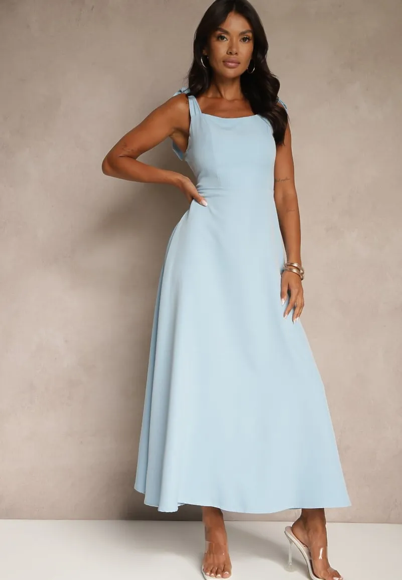 Niebieska Sukienka z Wiskozą o Rozkloszowanym Kroju z Wiązaniem Nilafeia
