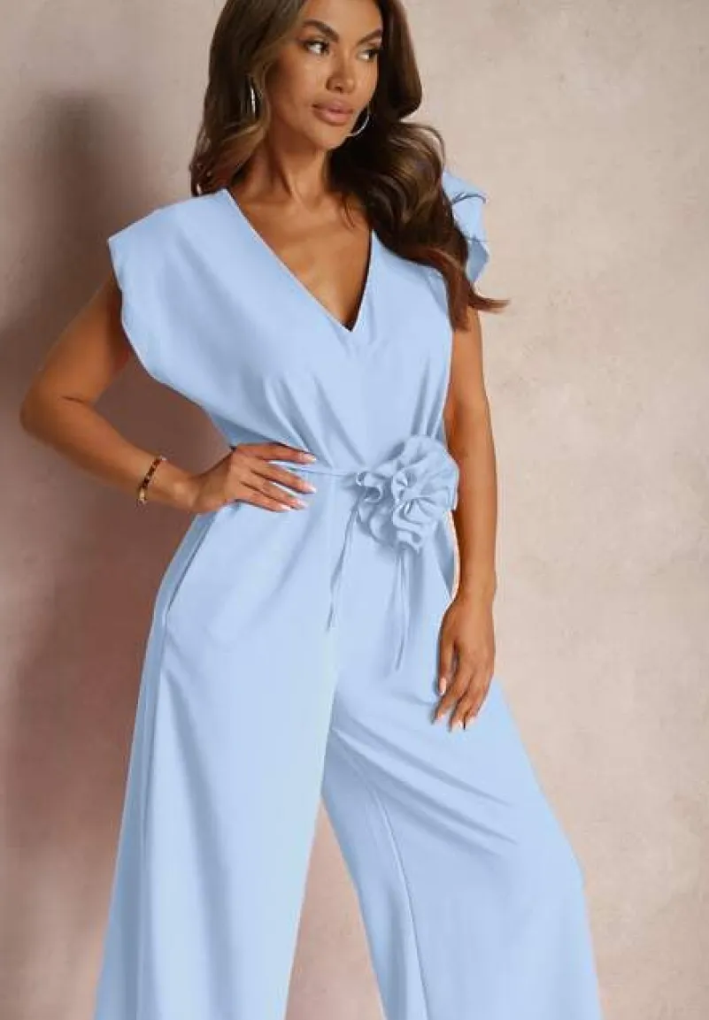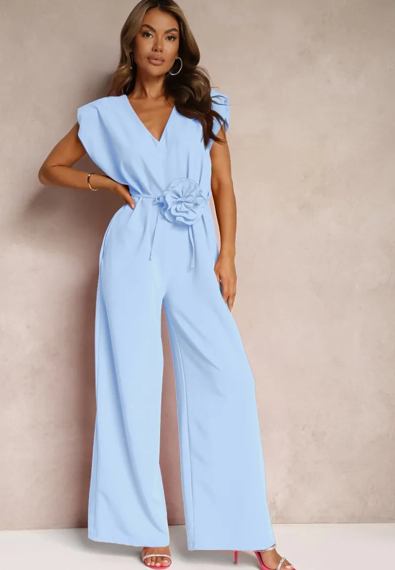 Niebieski Kombinezon Wykończony Prostymi Szerokimi Nogawkami z Wiskozą i Kwiatem 3D Dimentia