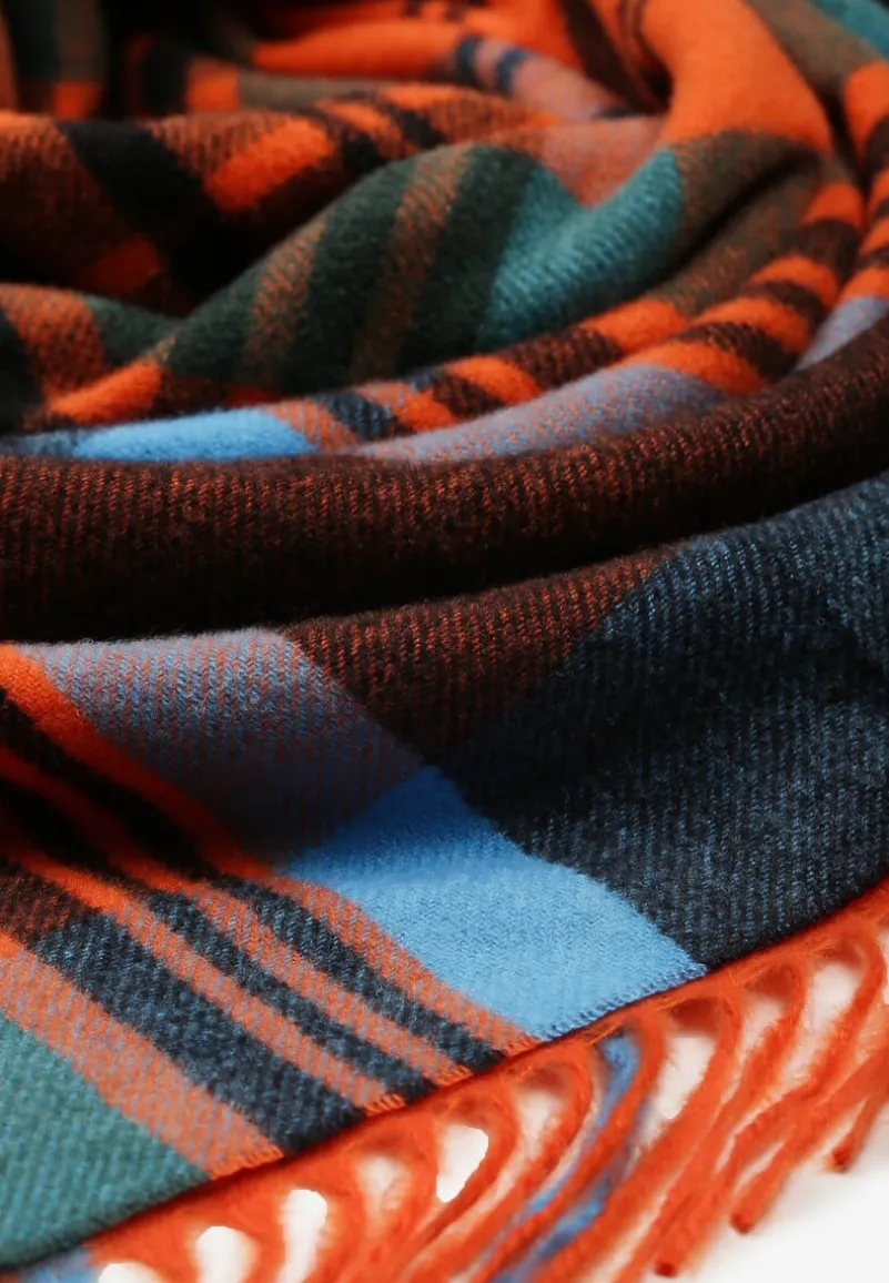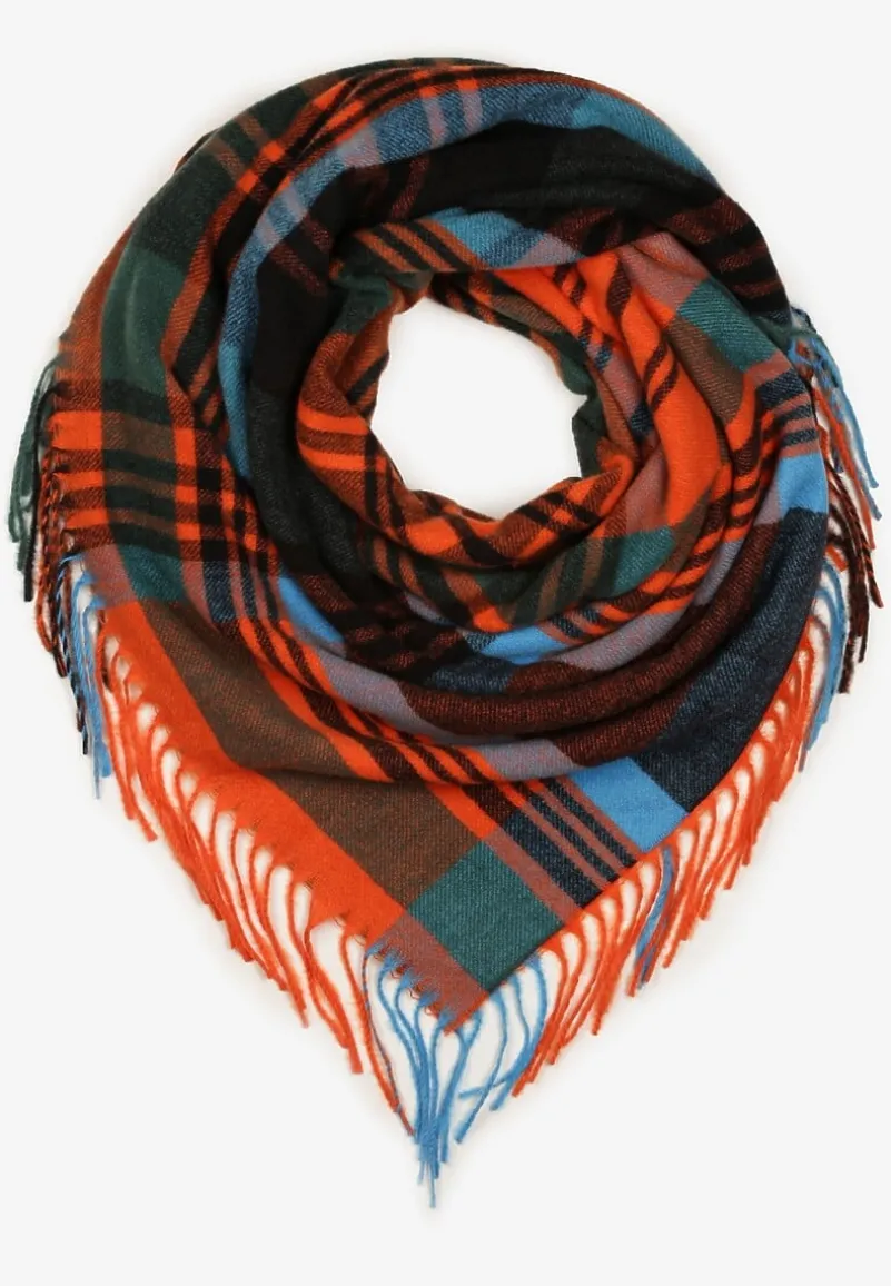Pomarańczowo-Niebieski Kraciasty Szalik z Wiskozy i Bawełny z Frędzlami Relavis