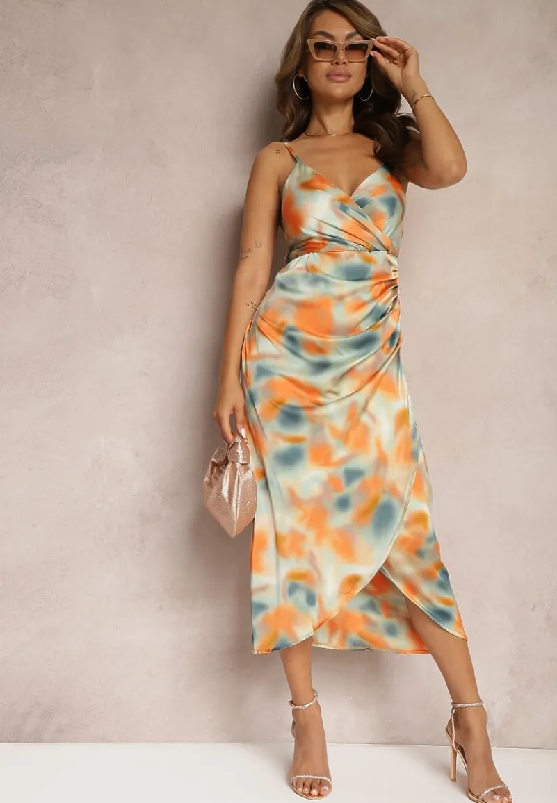 Pomarańczowo-Zielona Kopertowa Sukienka na Cienkich Ramiączkach o Satynowym Wykończeniu z Marszczeniami Vikida