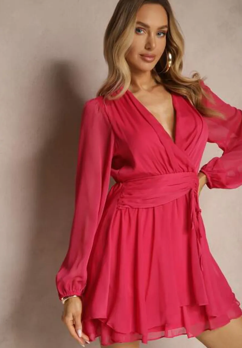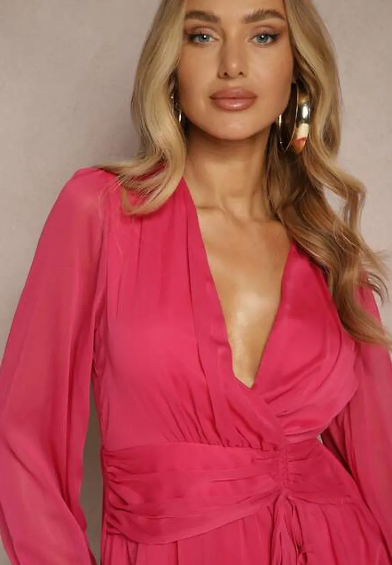 Różowa Kopertowa Sukienka z Prześwitującymi Rękawami o Rozkloszowanym Dole Ninelira