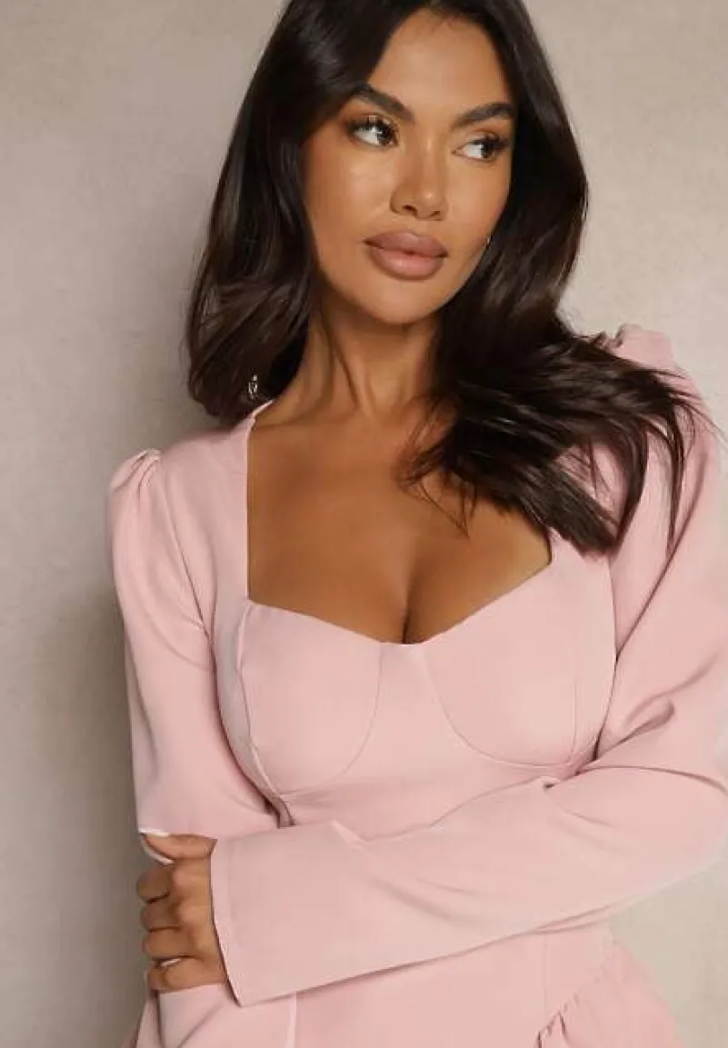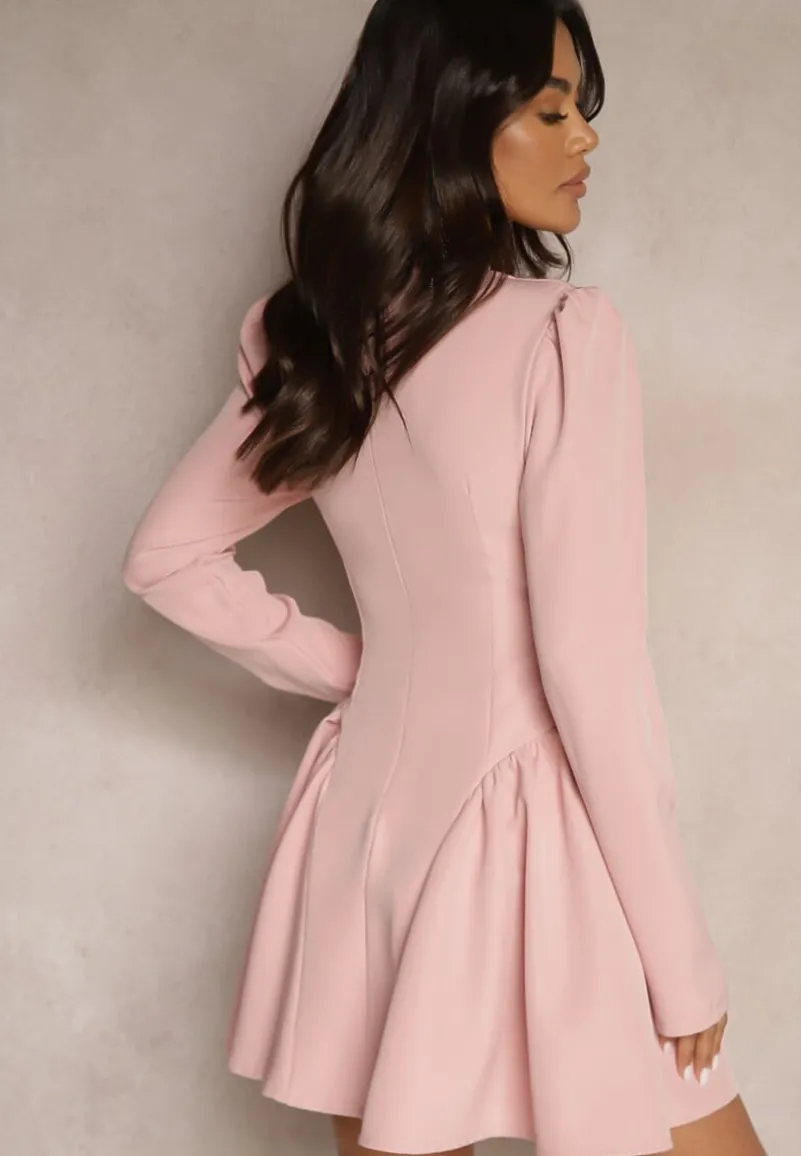 Różowa Rozkloszowana Sukienka Koktajlowa z Gorsetową Górą i Falbankami Arisora