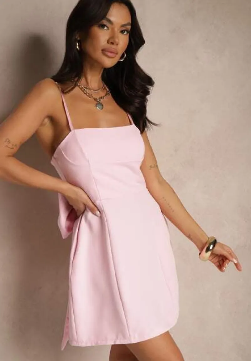 Różowa Sukienka o Rozkloszowanym Kroju na Ramiączkach z Dużą Kokardą Ivelvia