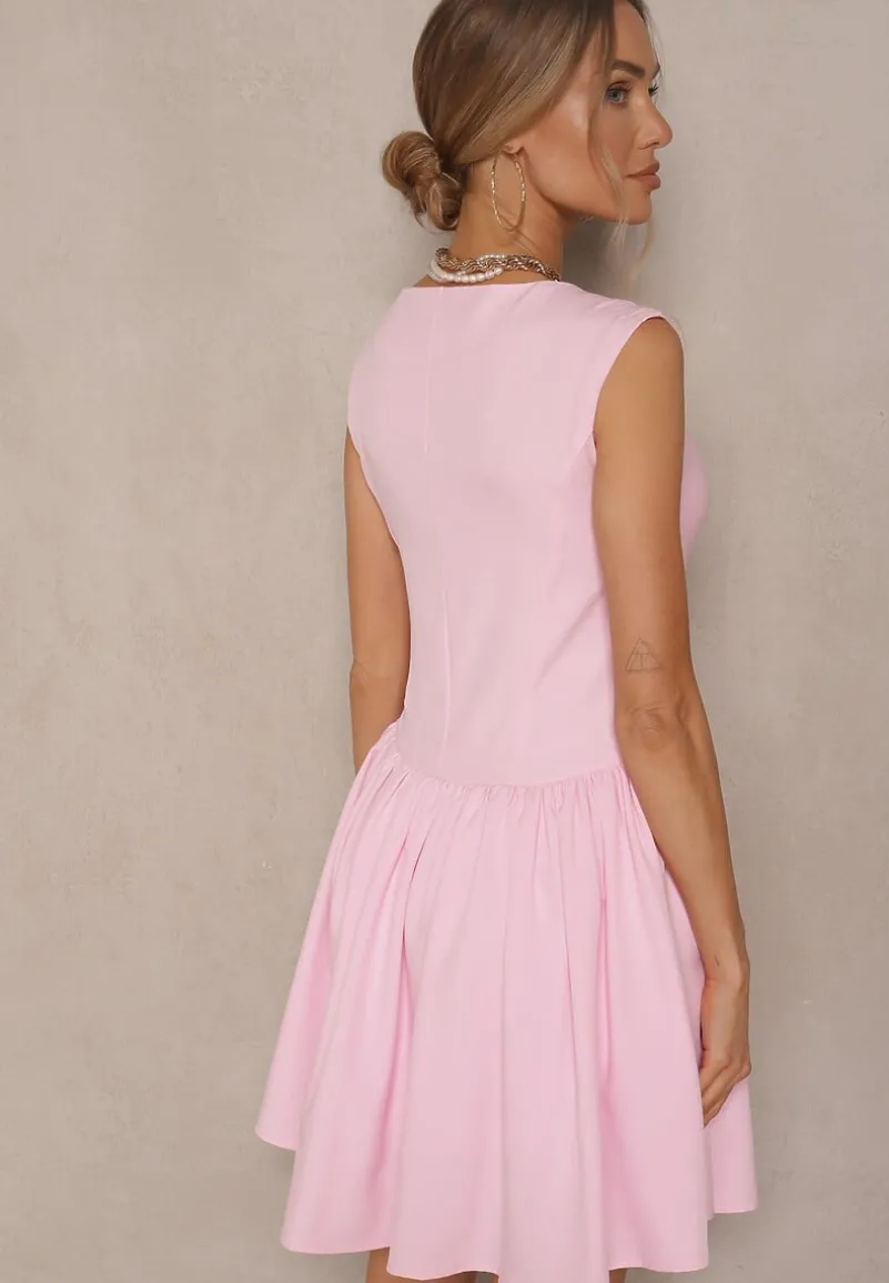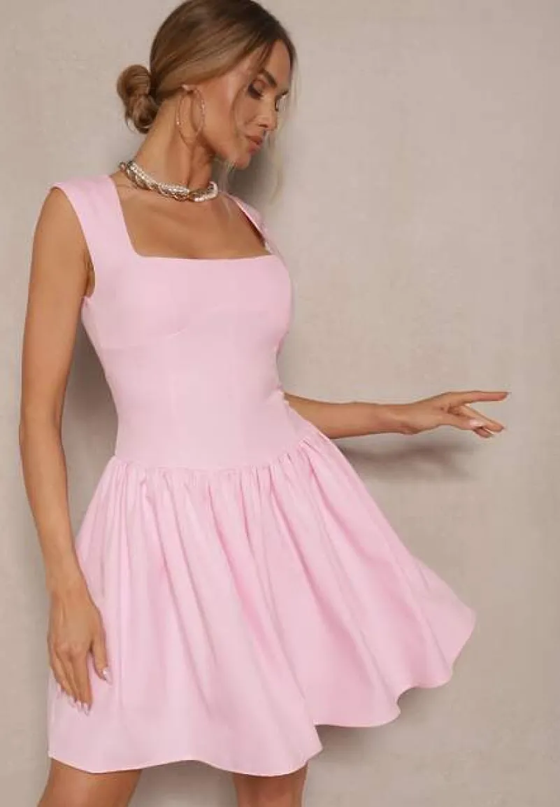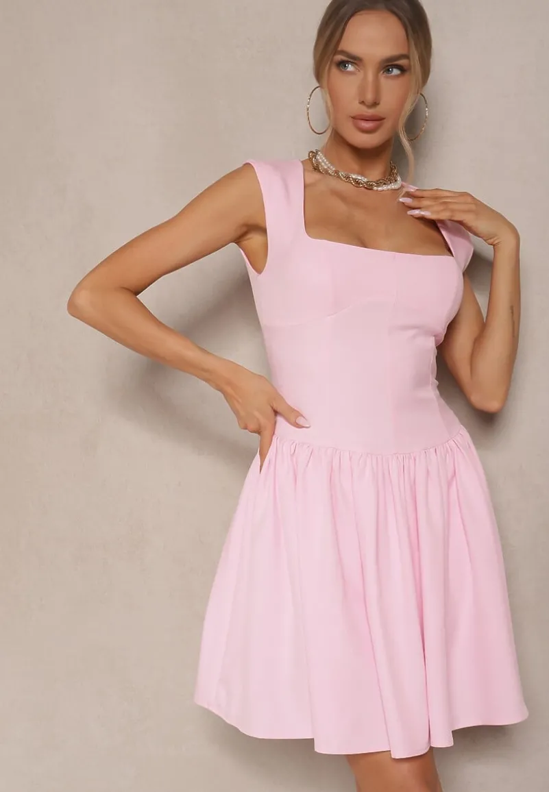 Różowa Sukienka o Rozkloszowanym Kroju z Kwadratowym Dekoltem Halivira