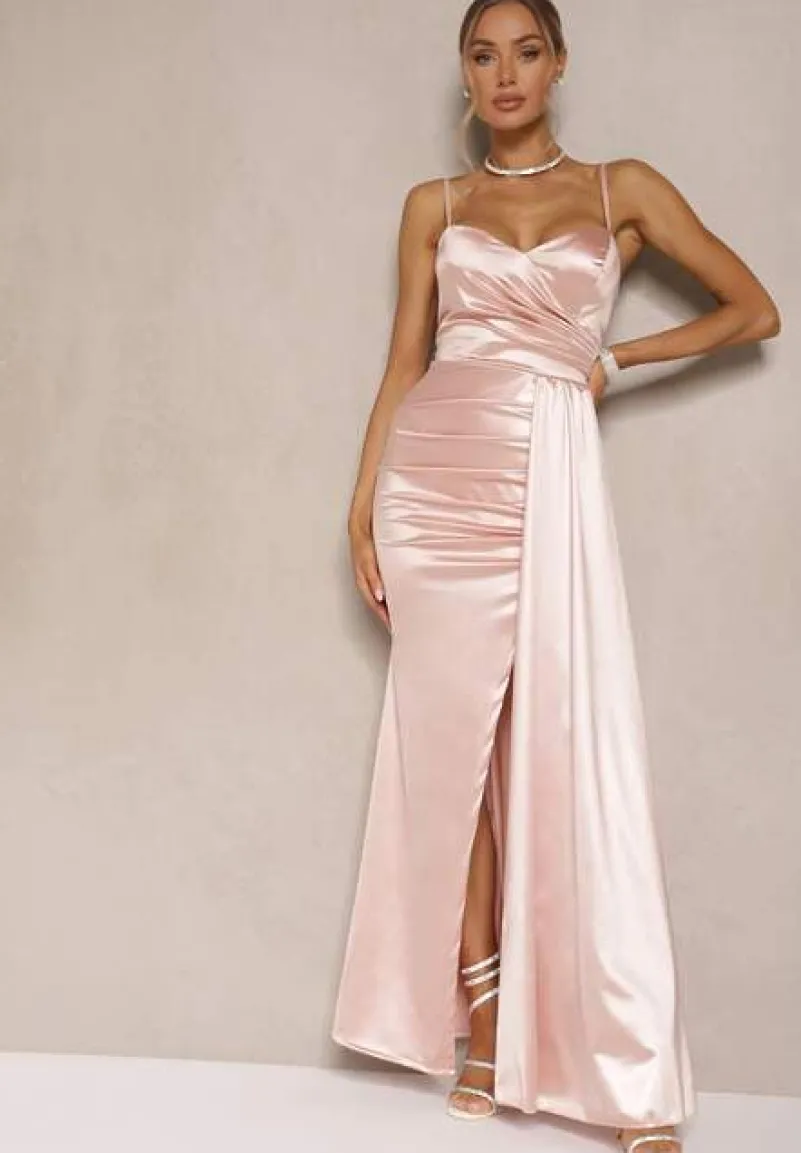 Różowa Sukienka Satynowa z Marszczeniem i Ozdobnym Trenem Katiriva