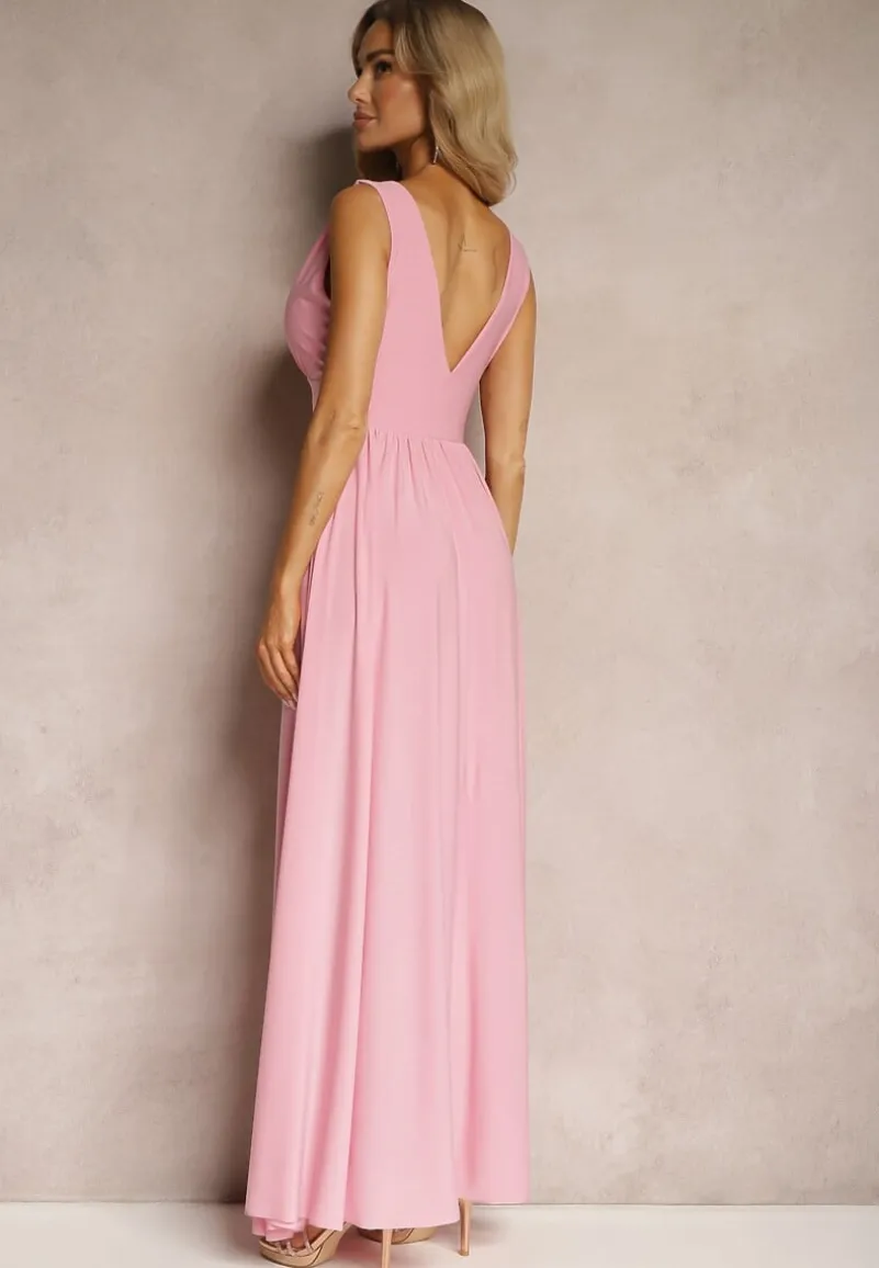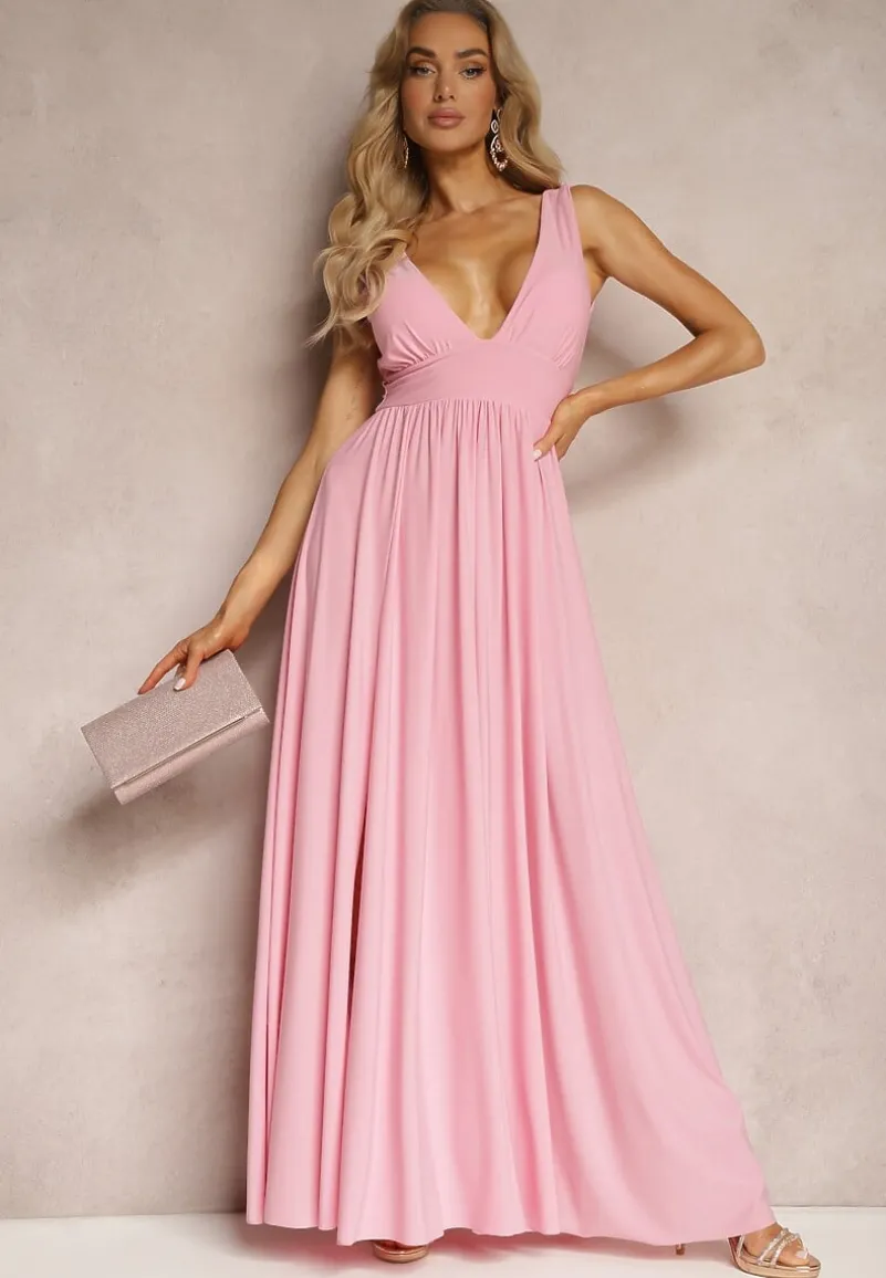 Różowa Sukienka Wieczorowa na Ramiączkach z Dekoltem w Szpic i Rozcięciem Nestanni