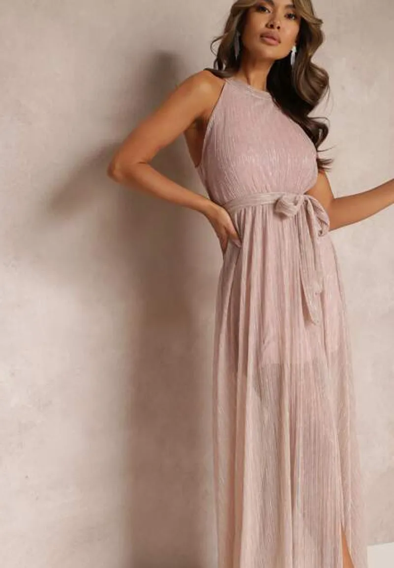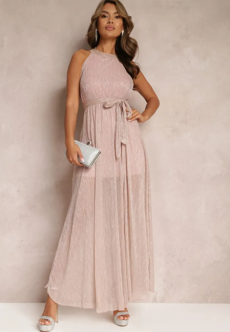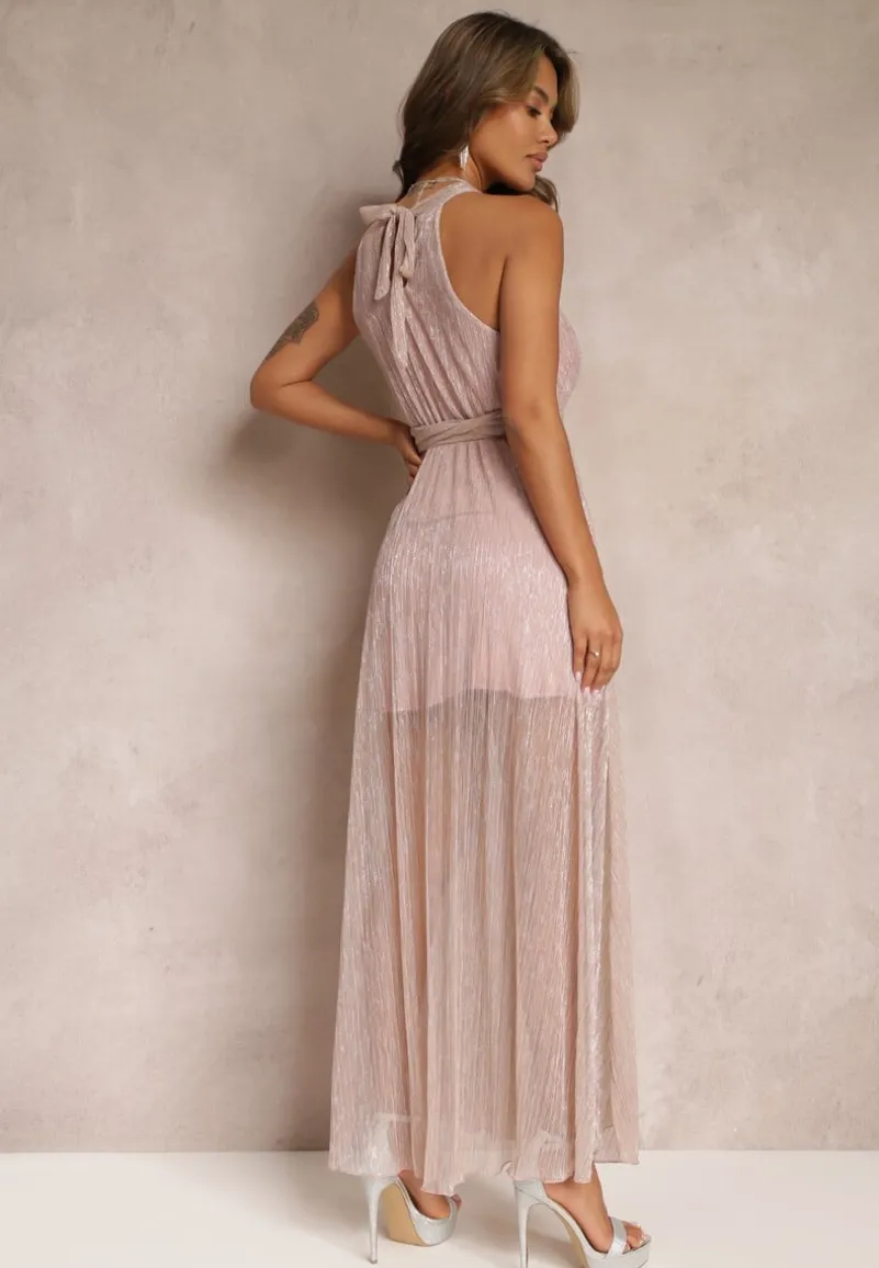 Różowa Sukienka z Dekoltem Halter Błyszczącą Nicią i Gumką w Pasaie Ketura
