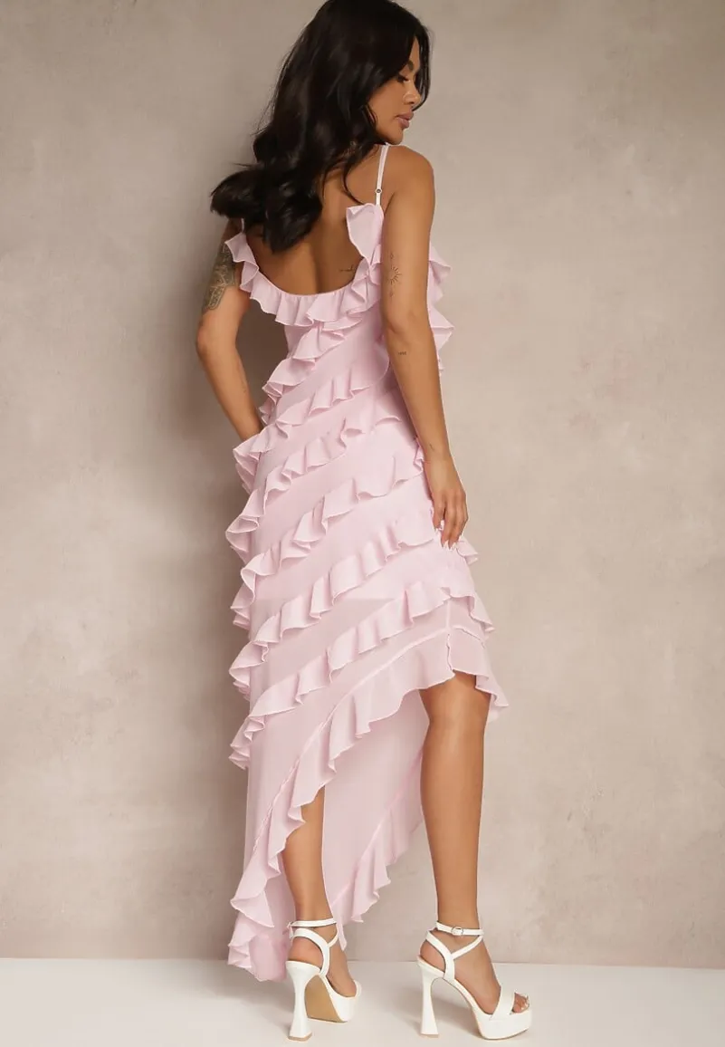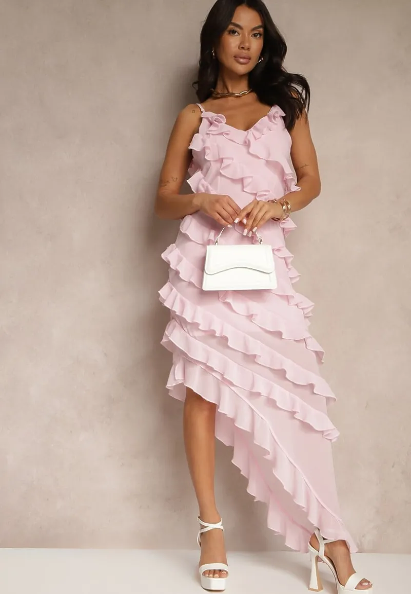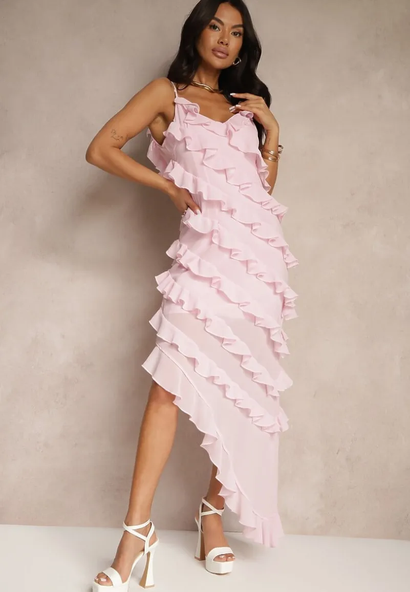 Różowa Sukienka z Falbankami o Asymetrycznym Kroju Linessiela
