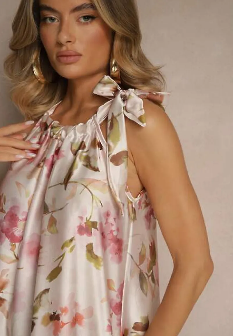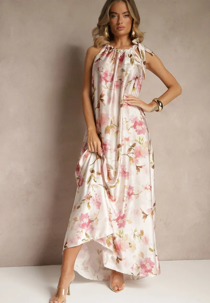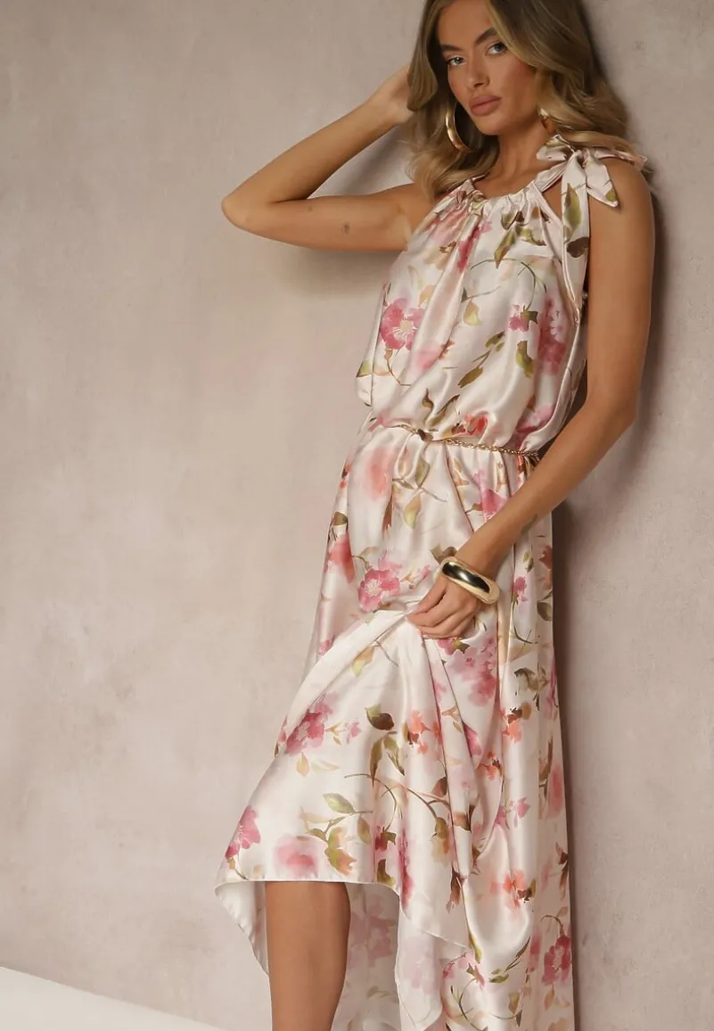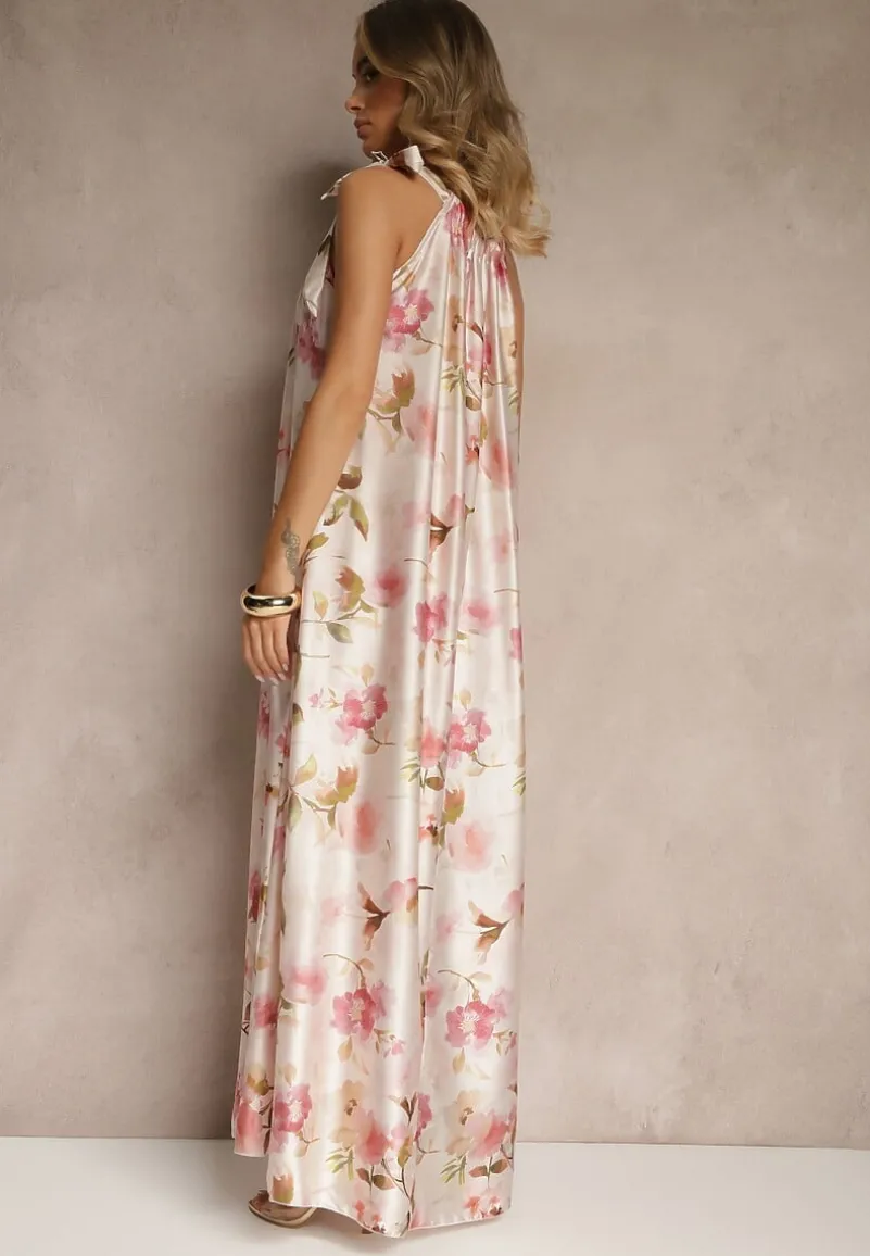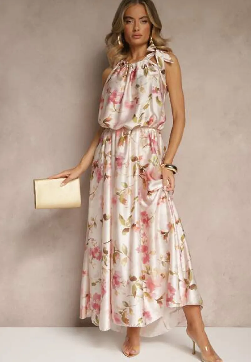 Różowa Sukienka z Satyny w Kwiatowy Wzór Fenimea