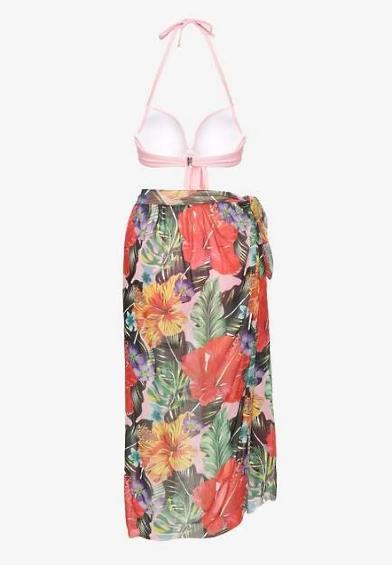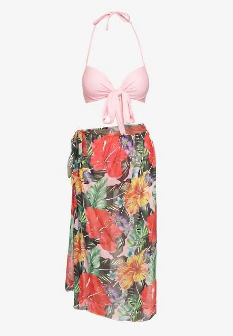 Różowe Bikini Majtki Figi Biustonosz z Wiązaniem i Kwiatowe Pareo Folanira