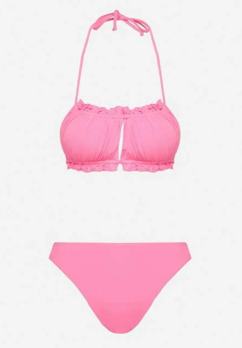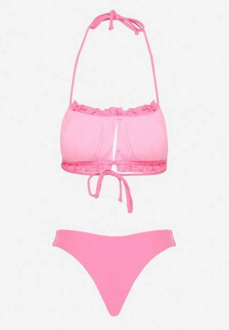 Różowe Bikini Majtki Figi Biustonosz z Wiązaniem Ozdobiony Marszczeniem Folinira