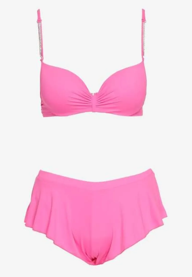 Różowe Bikini Usztywniany Biustonosz z Cyrkoniami i Spodenki Kąpielowe Wykończone Gumką w Pasie Rilamia